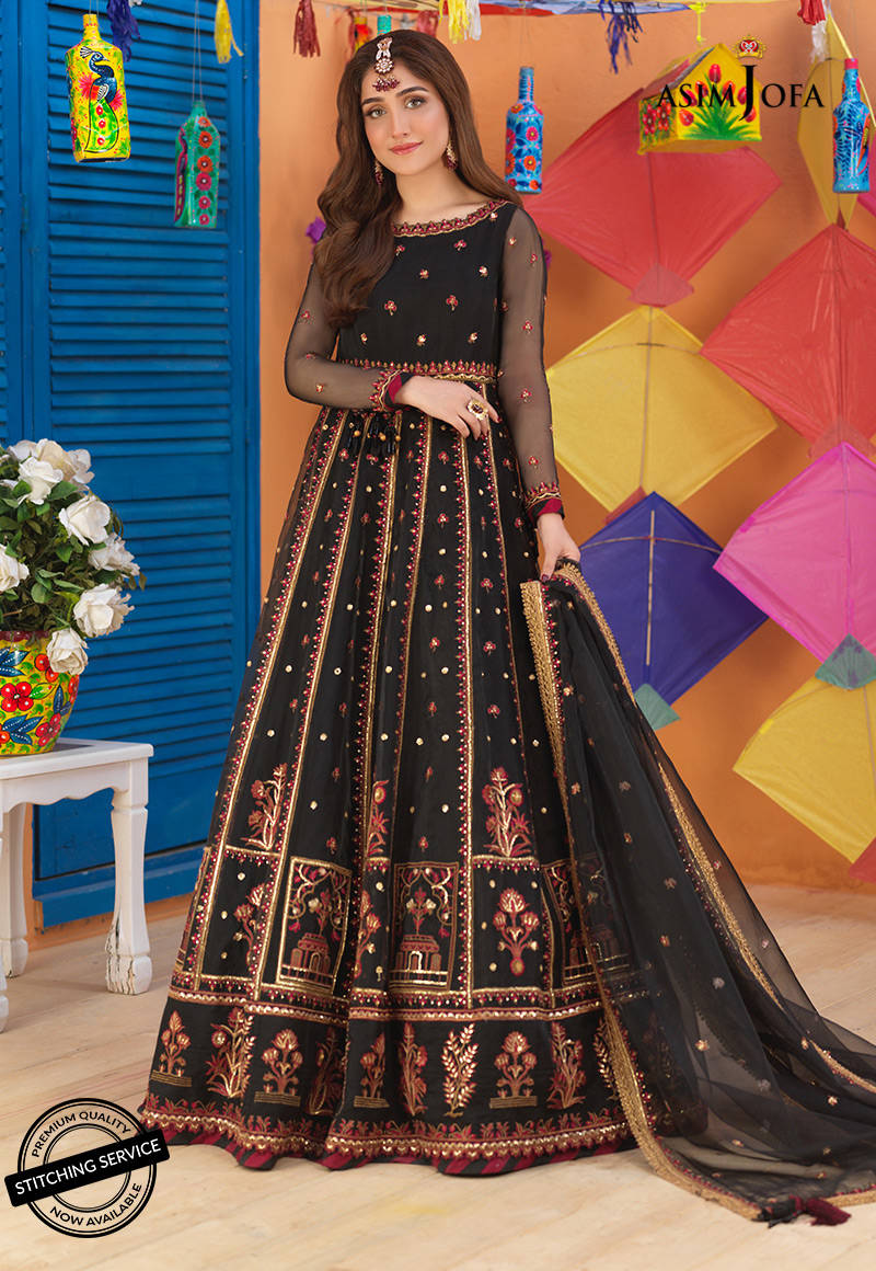 Add a touch of grandeur to your look with our beautiful pishwas in black. The attire is decorated with elegant work on kalis and gorgeous embroidered border are eminent on its voluminous lower hemline. It is paired with an embroidered dupatta in matching color blending in beautifully to create perfectly dreamy insights.