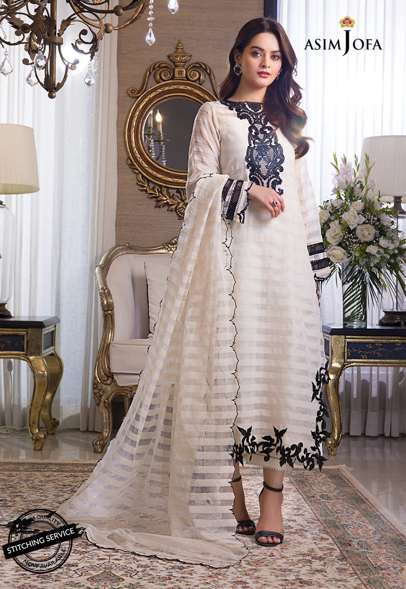 Tweak your artistic side by adorning yourself in this artsy design. Wide striped ivory karandi organza base paves way for black scrollwork embroidery pattern on neckline as well as along the hemline. Asymmetrically scalloped karandi dupatta works wonders with dyed cotton trouser thus completing the look of this distinct design.