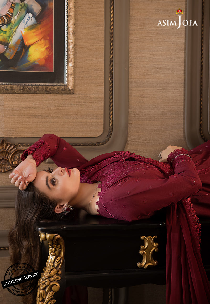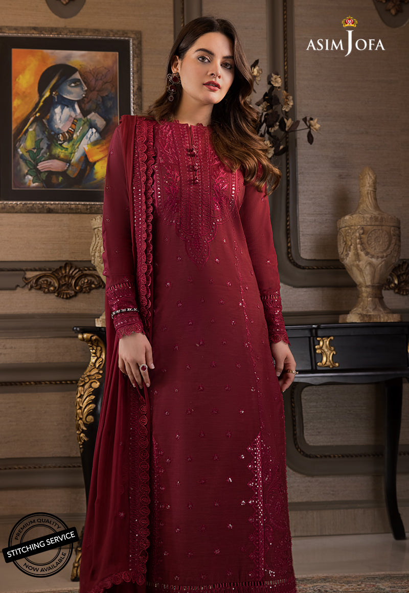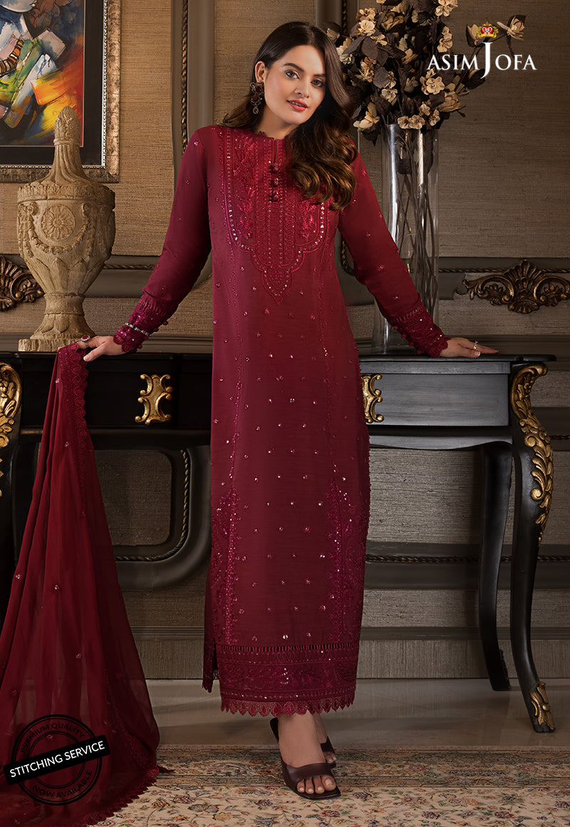 It is one-of-a-kind design executed to perfection on two toned carmine cotton base. Self-coloured thread saturated with transparent sequins is used achieve this iridescent feel in embroidery. This design is complemented by a heavily embroidered chiffon dupatta and dyed cotton straight pant.