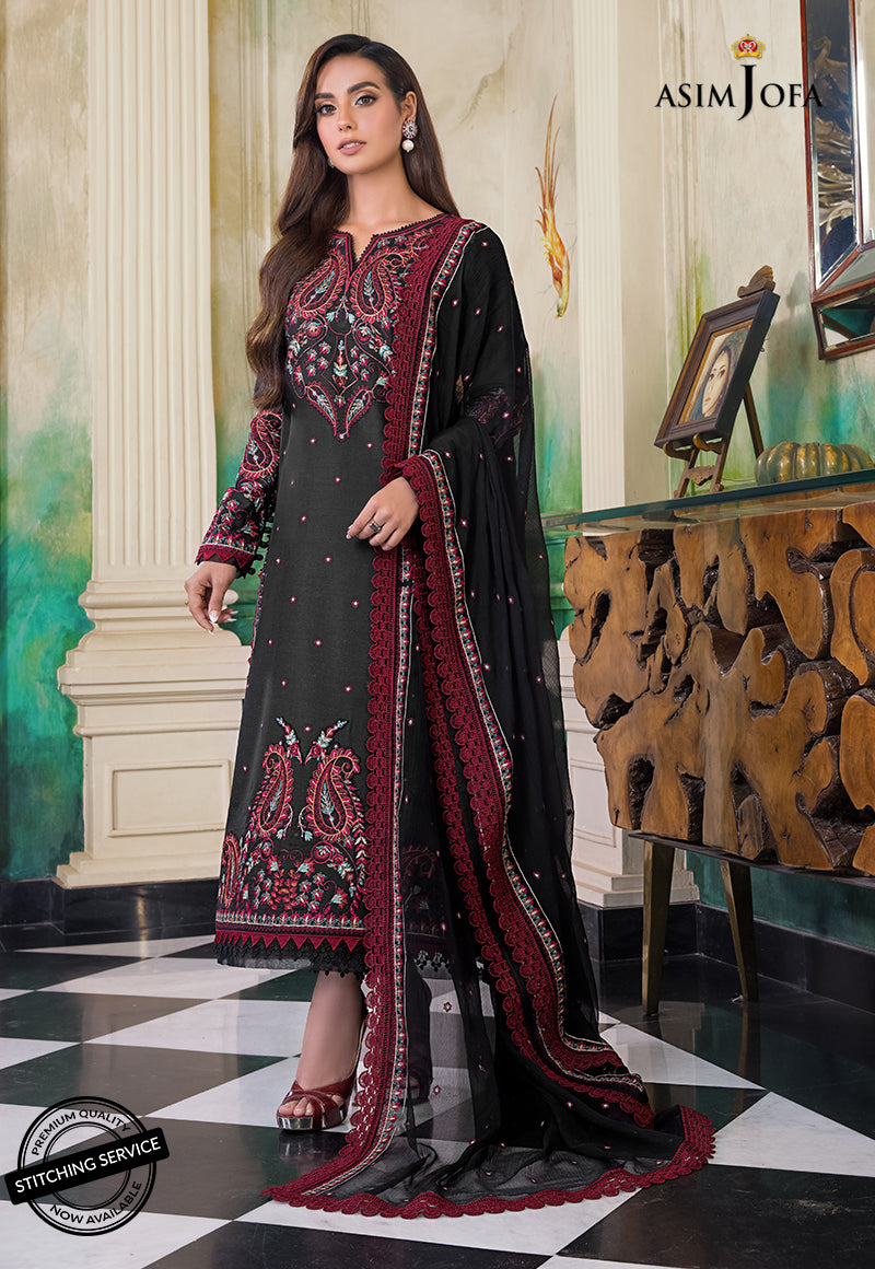 Iqra exudes grace in this traditional design. Artistically blending paisley imagery with colorful thread work etched beautifully on obsidian base of paper cotton. Fully embroidered straight shirt along with heavy neckline and hem are further accentuated with beautifully embroidered chiffon dupatta and cotton pants.