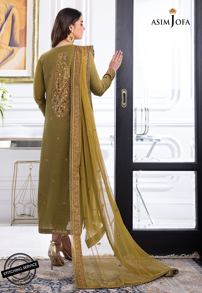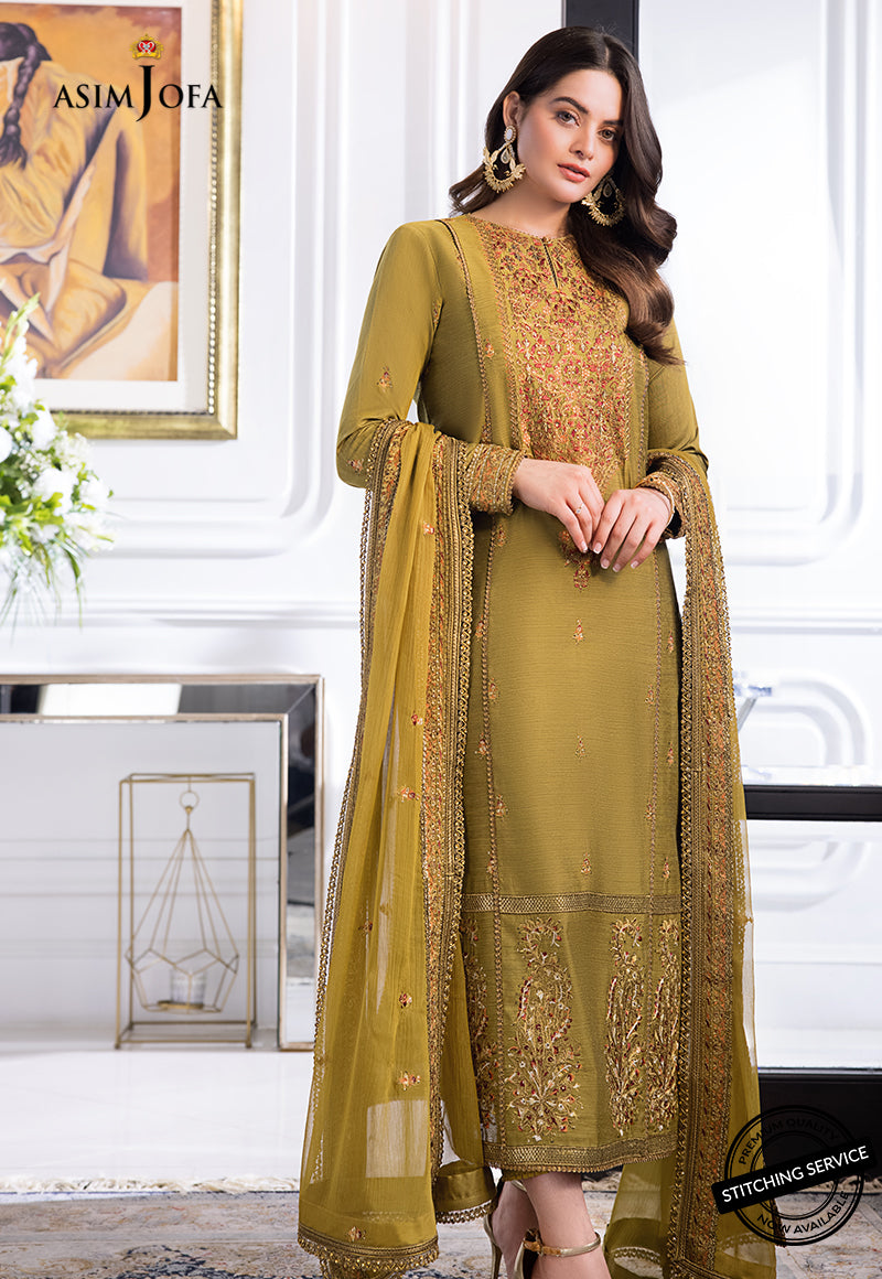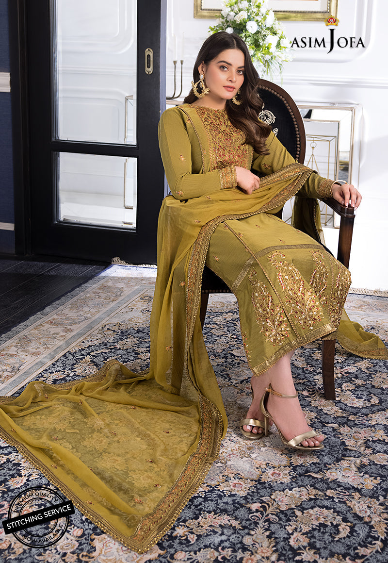 Minal Khan is a vision to behold in this gilded mustard color. Paper cotton gives this design an ethnic touch. Antique gold zari used with matte sequins and a beautiful combination of maroon and rust threads. It boasts an embroidered chiffon dupatta along with cotton pants.
