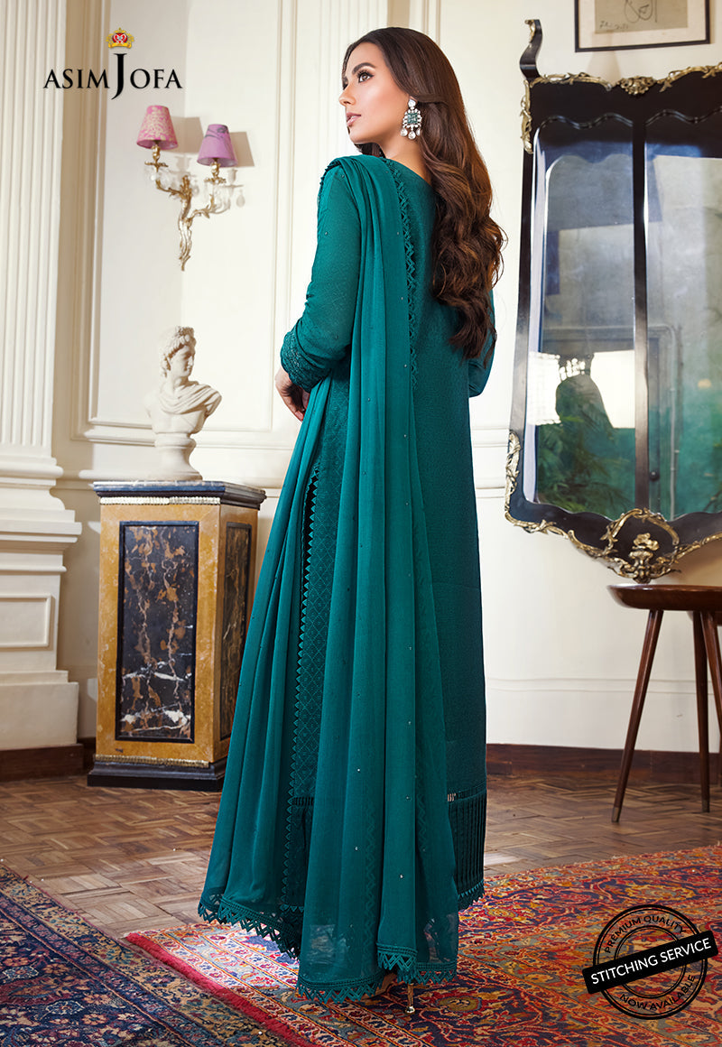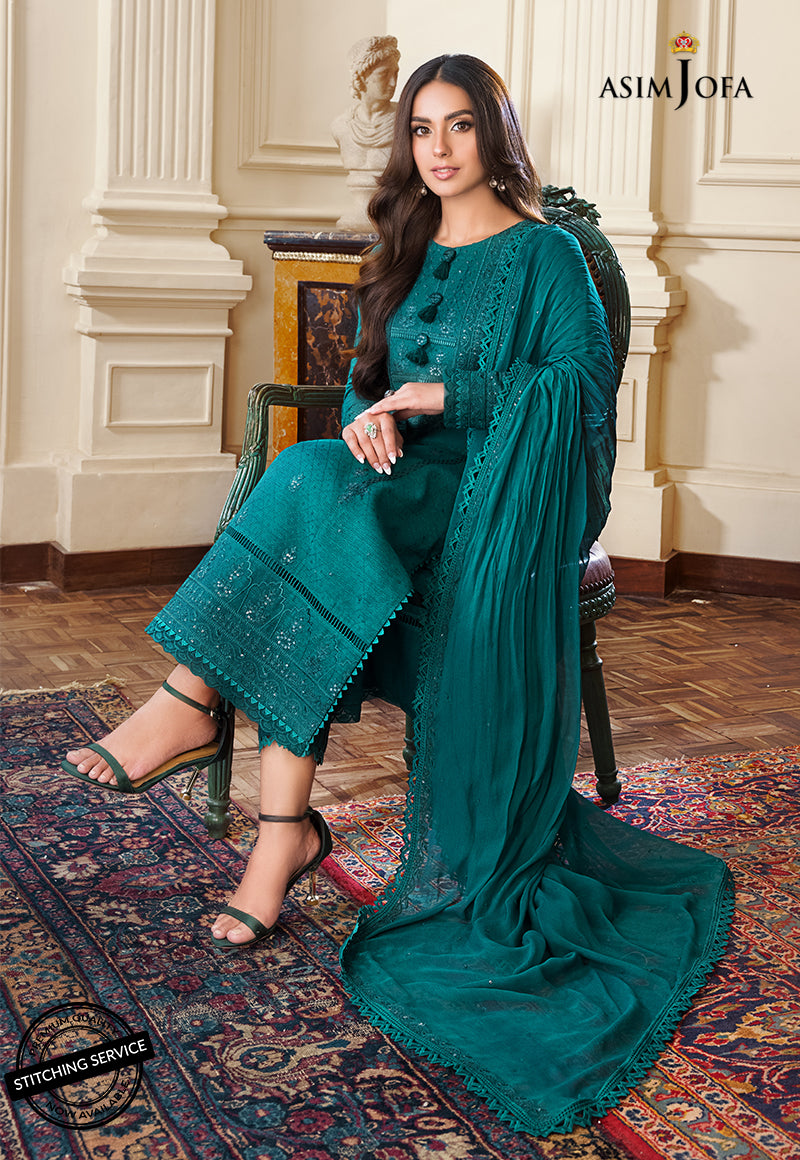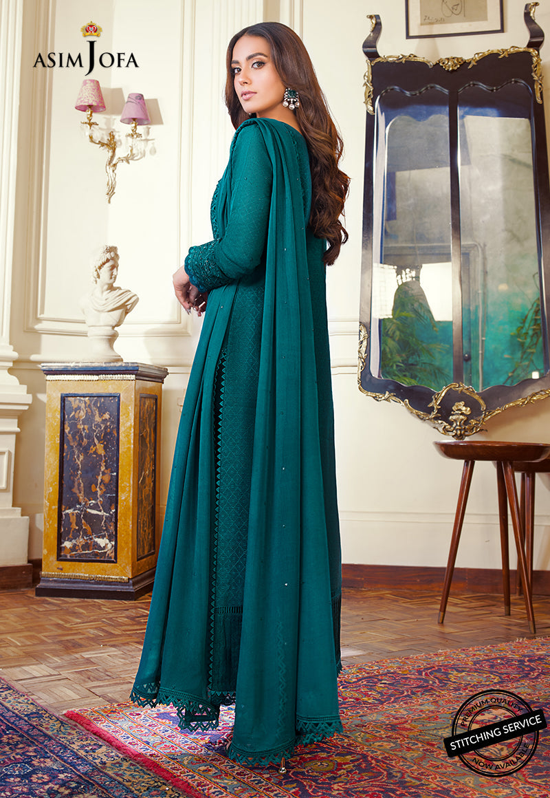Iqra Aziz oozes grace in this captivating design. Shimmery spangles dazzle on sea green self jacquard base. A straight silhouette is rendered with delicate threadwork ending in a heavy border along the hemline replicated in sleeves. It comes with a sprinkled chiffon dupatta including borders and dyed cotton pants.