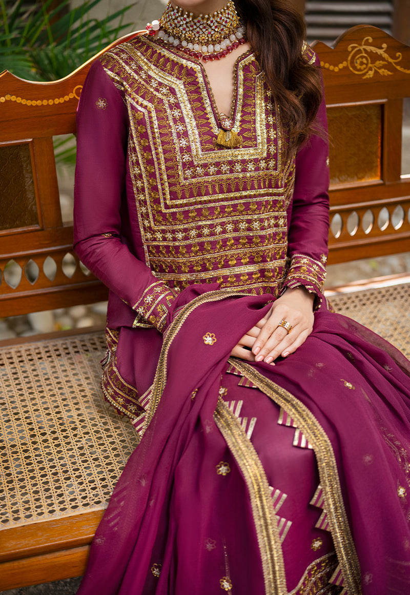 Komal Meer is a vision to behold dressed in this long magenta shirt embroidered with zari & sequins used meticulously to create this beautiful design with a unique neckline. It comes with embroidered chiffon dupatta & dyed trouser.