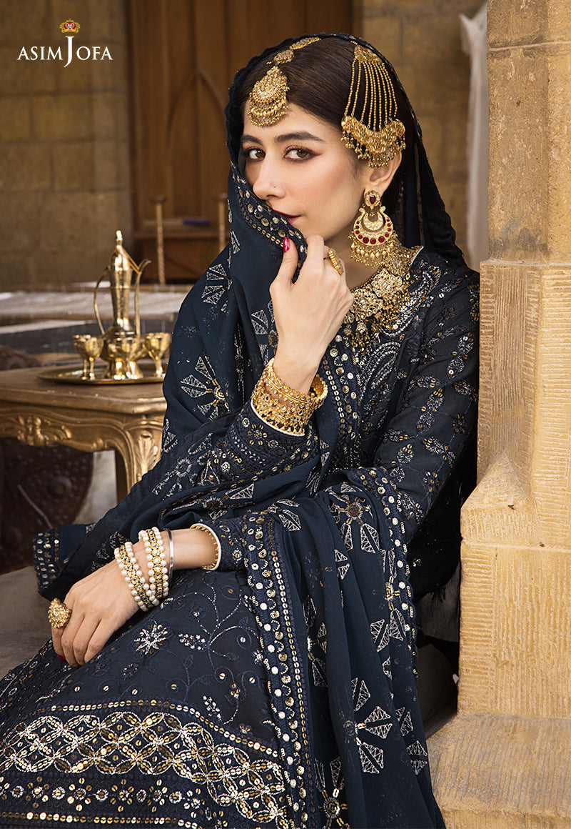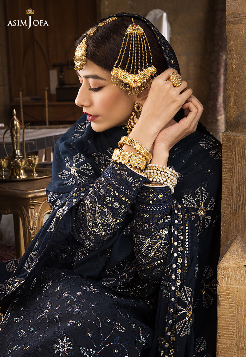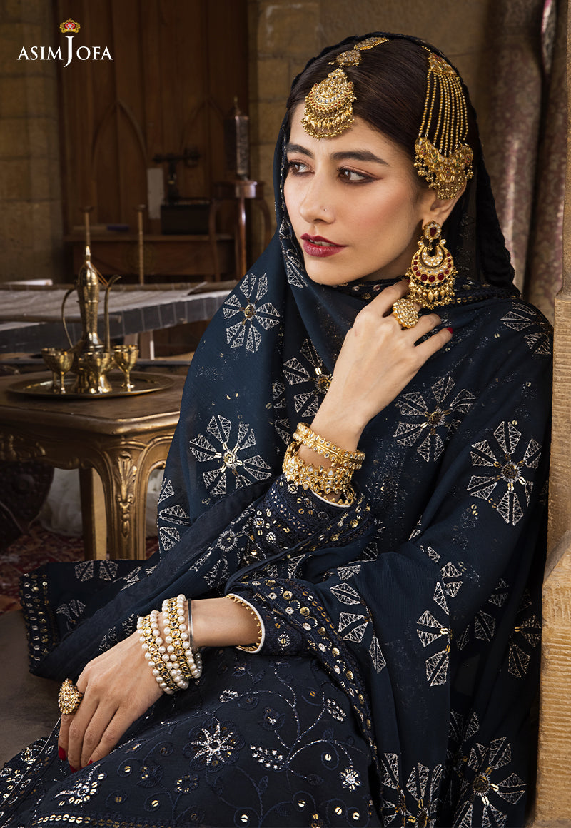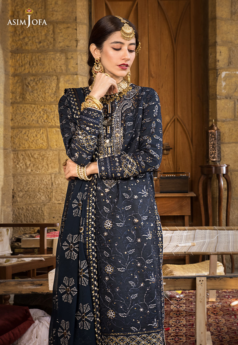 Deep teal blue Chanderi cotton is laden with beautifully done Chikankaari along with silver lurex & golden 5mm spangles impeccably used giving it an antique ganga Jamni look. The shirt is hemmed with heavy double borders along front & back. It comes with an embroidered chiffon dupatta & dyed trouser.