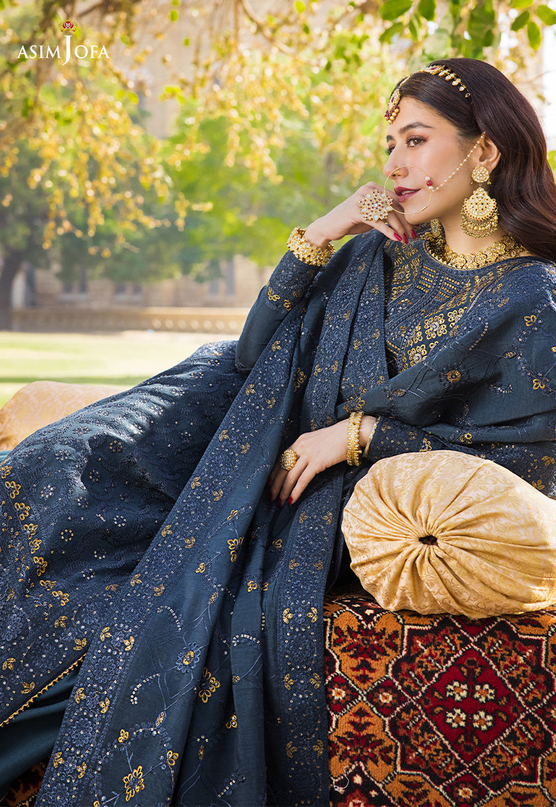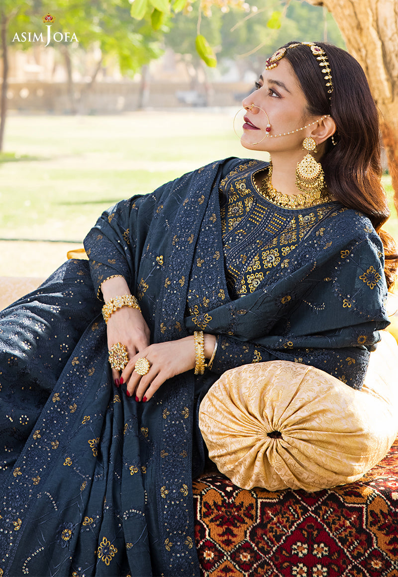 Deep teal color is enlivened with heavy chikankaari embroidery punctuated by matte gold sequins & zari working wonders on this shade. This look is rounded off with a lushly embroidered dupatta & dyed pants.