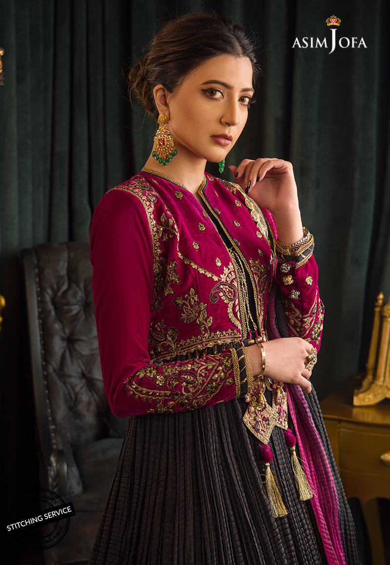 Evoke a princess charm with this timeless black crush peshwas worn with deep magenta velvet waistcoat heavily embellished with antique gold zari and sequins with complementing threads. Its voluminous skirt is decorated with embroidered border along the hem with a crushed two toned organza dupatta.