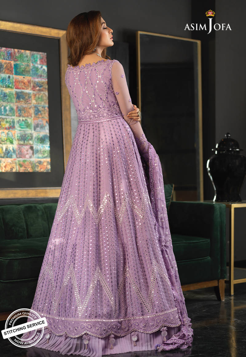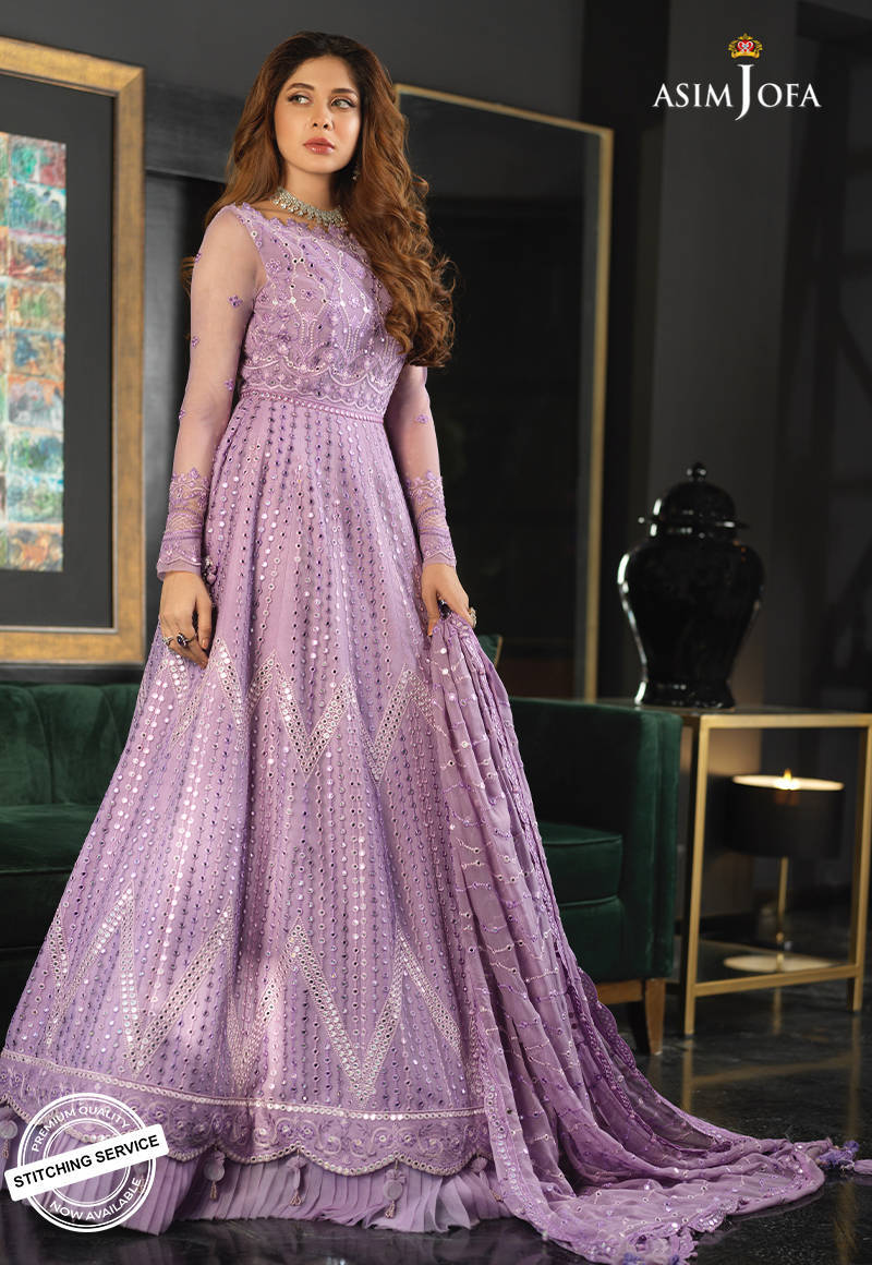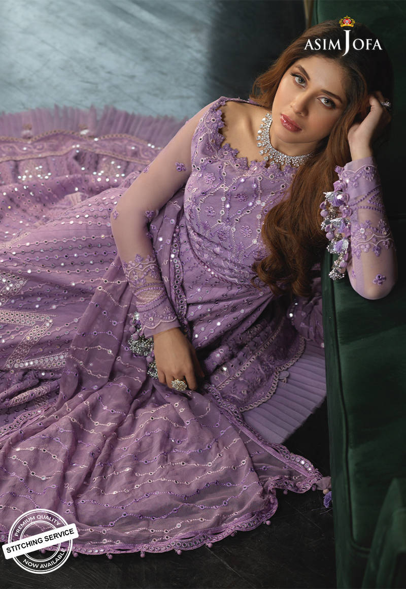 Azekah is beaming like a moon clad in this stunning lilac ensemble. The whole outfit is glinting with the scattering of 9mm sequins used in geometric pattern on sheer tulle base, topped with an equally embellished chiffon dupatta highlighting the whole look of this stunning design. It comes with a dyed silk trouser. Over shadow all by donning this classic design.