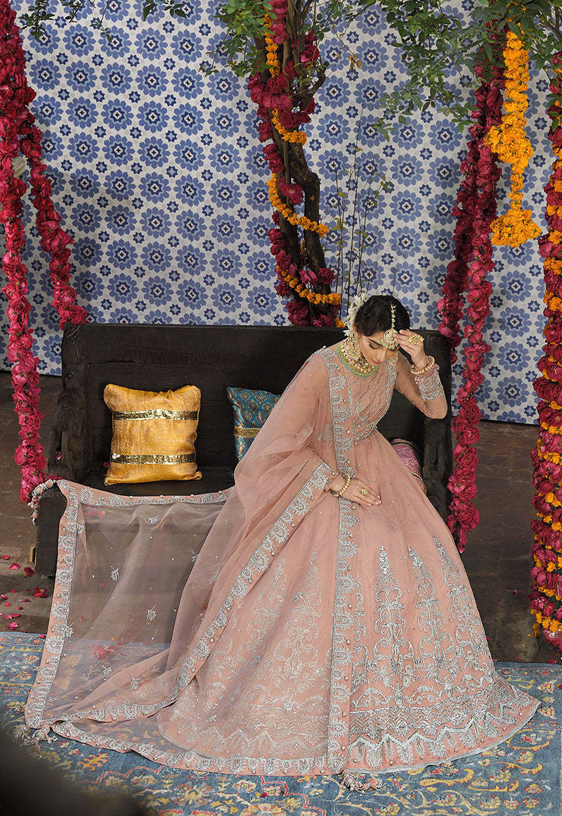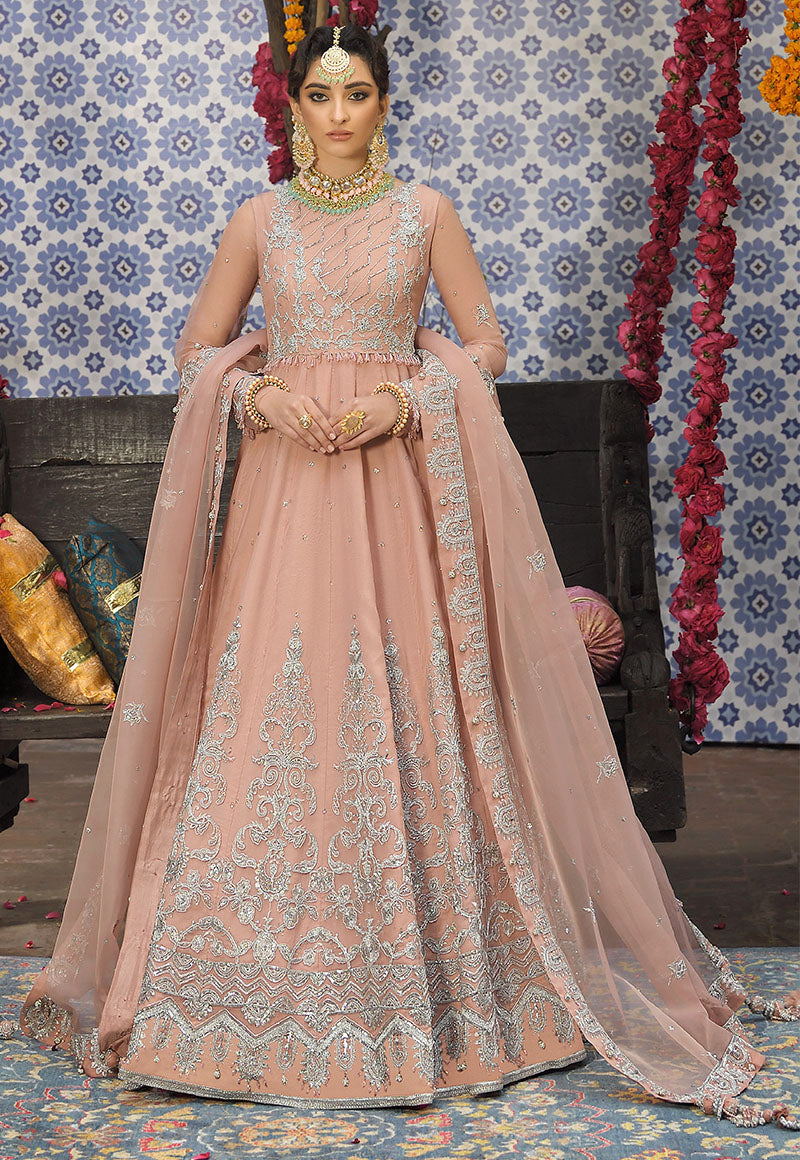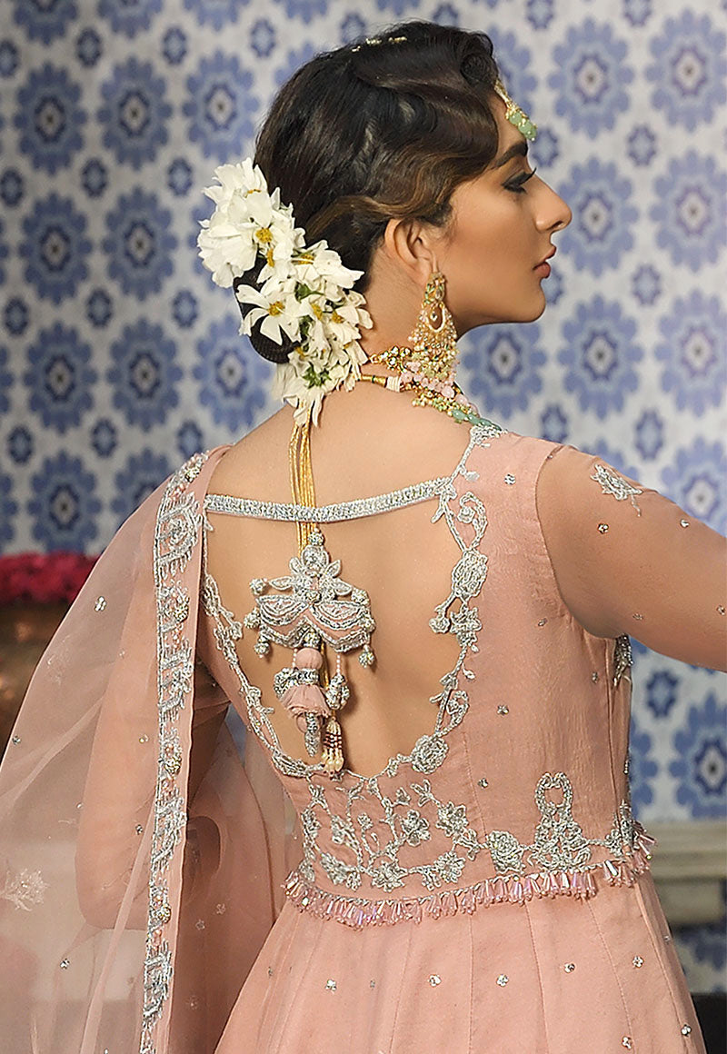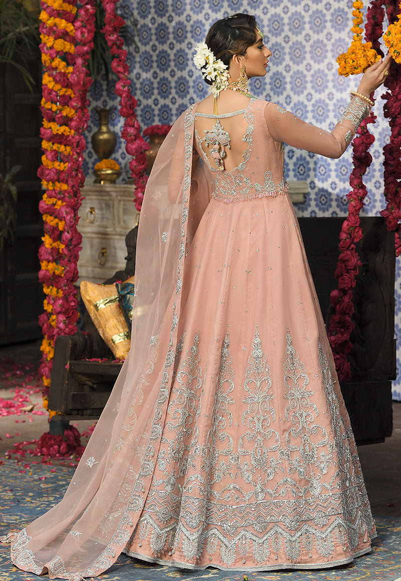 This Salmon pink peshwas centers on styles and cuts depicting that time in the past through whimsical fabrics and subdued color schemes. Outfit is magnificently embroidered in silver details with gorgeous decorative motifs are engraved on all over the hemline. Dori patterns on this design enhances the royal look of this attire. It is paired with cotton silk trousers and an embroidered dupatta with embellished borders in silver on all 4 sides infused with elegance for a royal look. The symmetry of the design and big motifs create a fine balance between delicacy and timeless refinement.