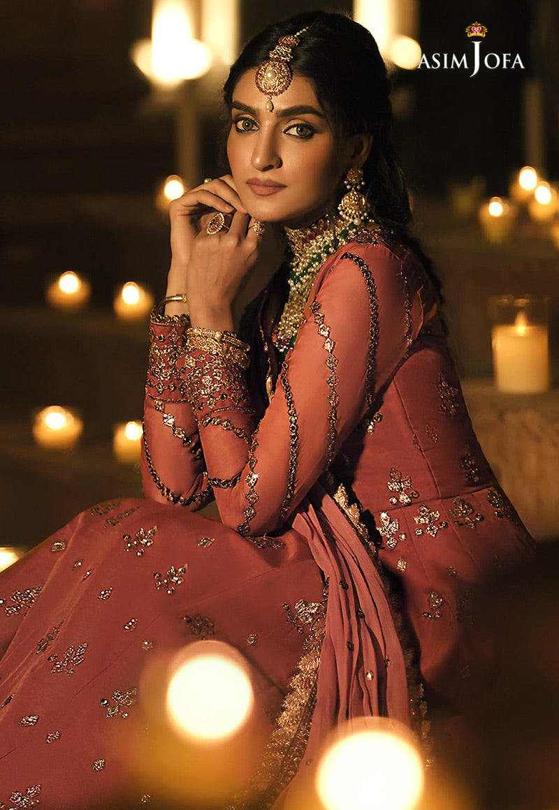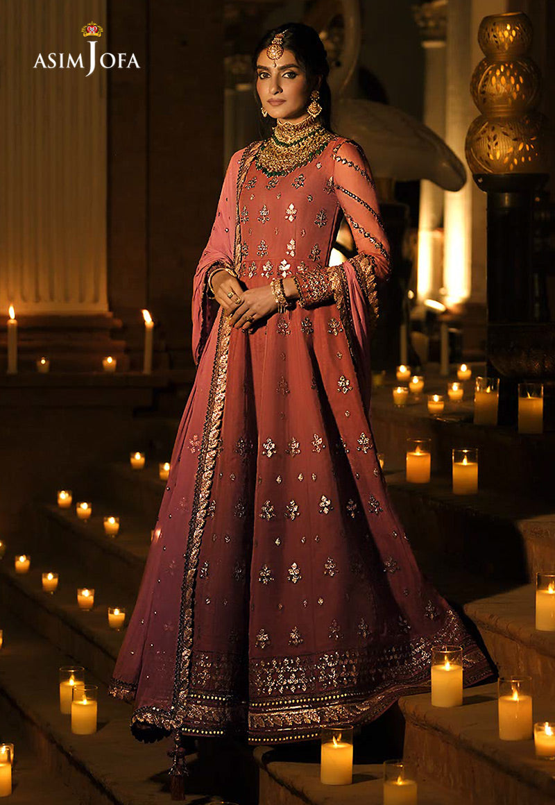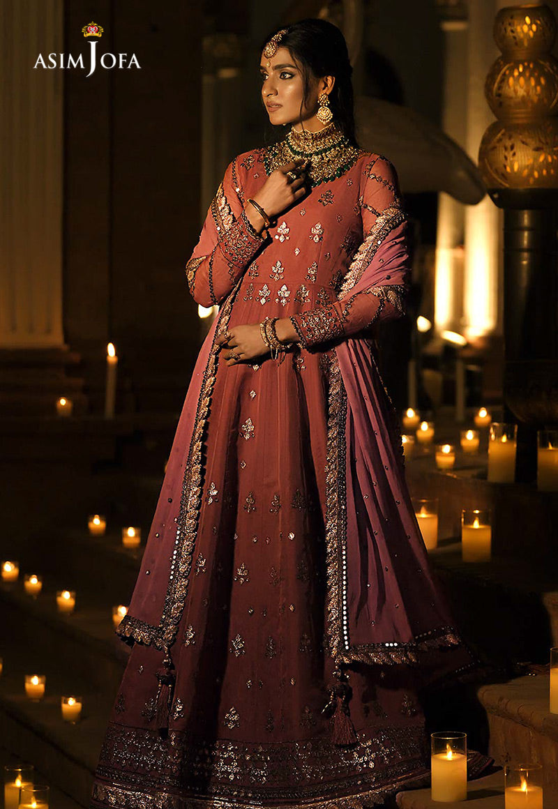 This alluring rust outfit features graceful details of embroidered kalis crafted on organza. This full length peshwas is adorned with beautiful panni work in hues of gold and antique gold mixed together to form this traditional attire radiating charm and grace, to give you another stunner look to pull off this wedding season. It comes with a muted salmon pink chiffon embroidered dupatta and solid dyed pants.