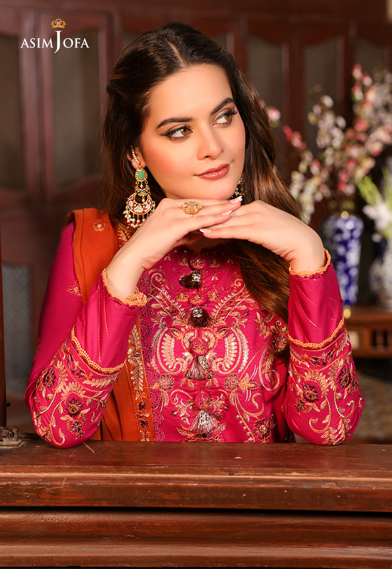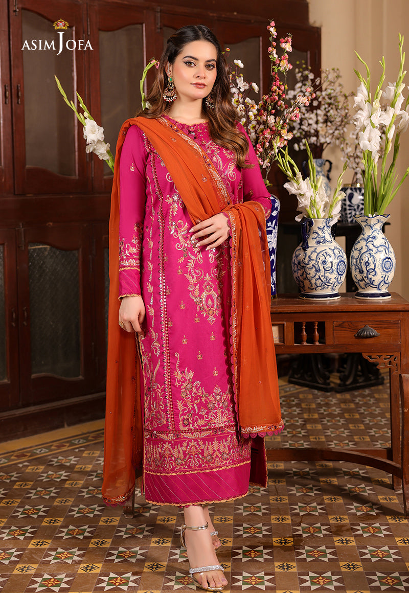 A sensuous stitching that envelops you in modernity and enhanced with a beautifully embroidered chiffon dupatta shimmers with sequin encloses on an embroidered landscape fuchsia pink.