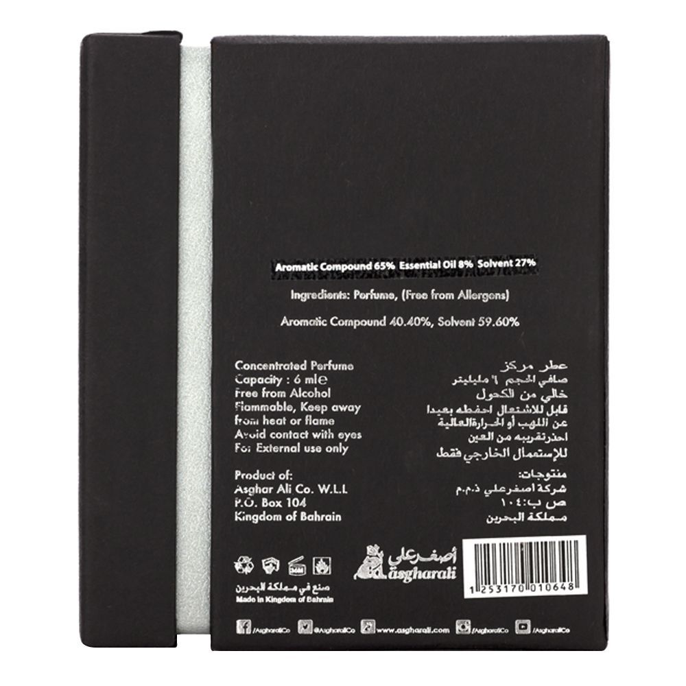 Asgharali Musk Abyid Attar is an interesting blend of fruity and floriental fragrances. It delivers an edible and flavorful feel with a refreshing fruity top note. It gives away a subtle trace of a baby-powder aroma. The powdery and flowery middle note consists of a sensational combination of violet, lily of the valley and roses. Dynamic blend of musk, amber, cedarwood and sweet vanilla creates a soulful vibe. The comforting fragrance is appropriate for use by men and women. It comes in a grey metallic bottle, carefully crafted in an antique design.