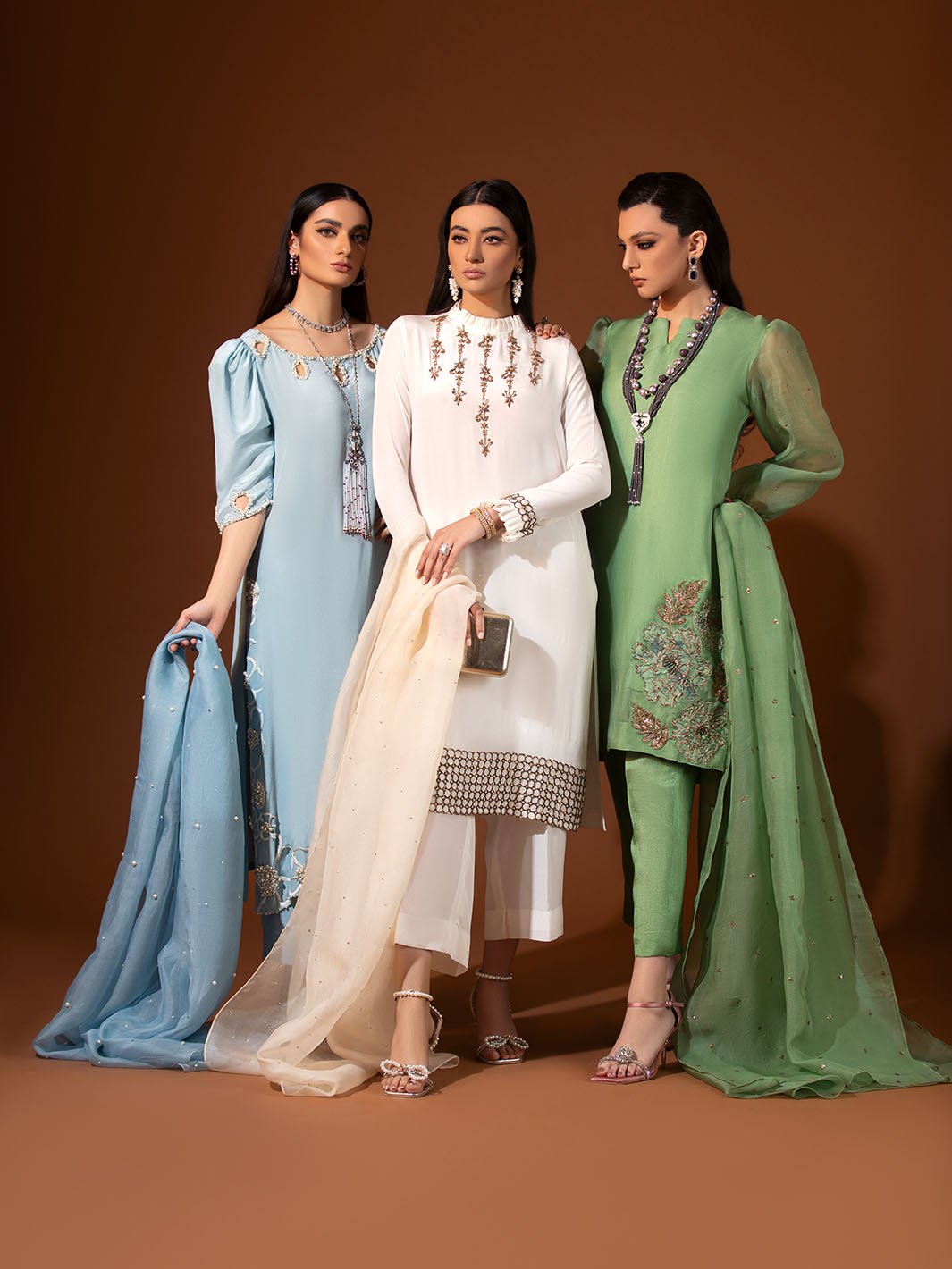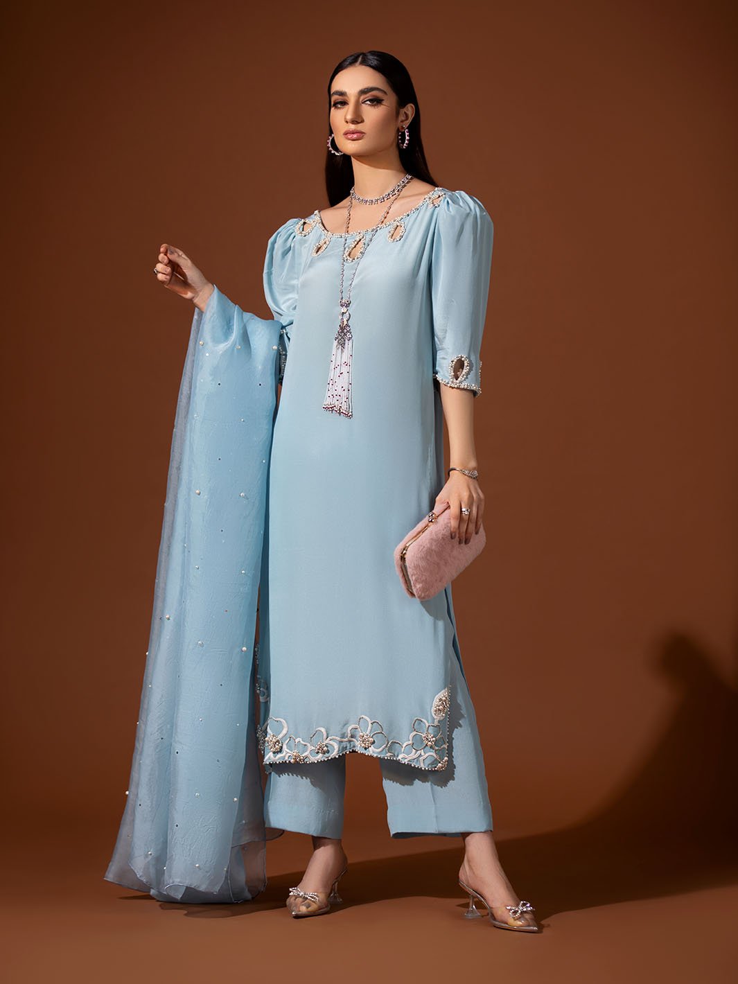 Glimmer in the sky blues in this head-turning ensemble with a three-dimensional pearl, cutdana, nug and resham embroidery on a grip shirt perfectly coupled with a plain grip trouser and an organza dupatta with pearls sprinkled on it.