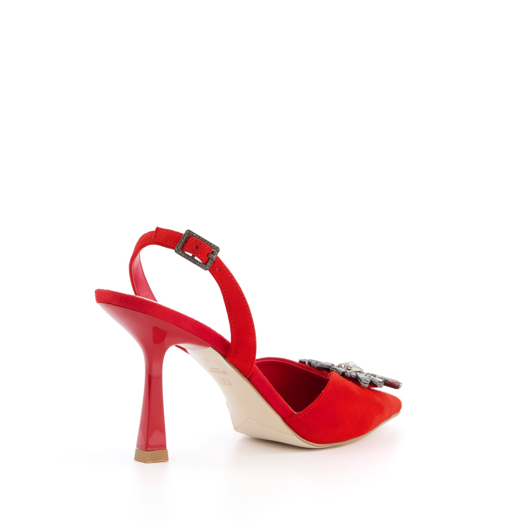 Introduce elegance to your look with this slingback heel from Dune London. This feminine style features a classic buckle fastening. It's adorned with a sparkling stone brooch and perfect for occasions.