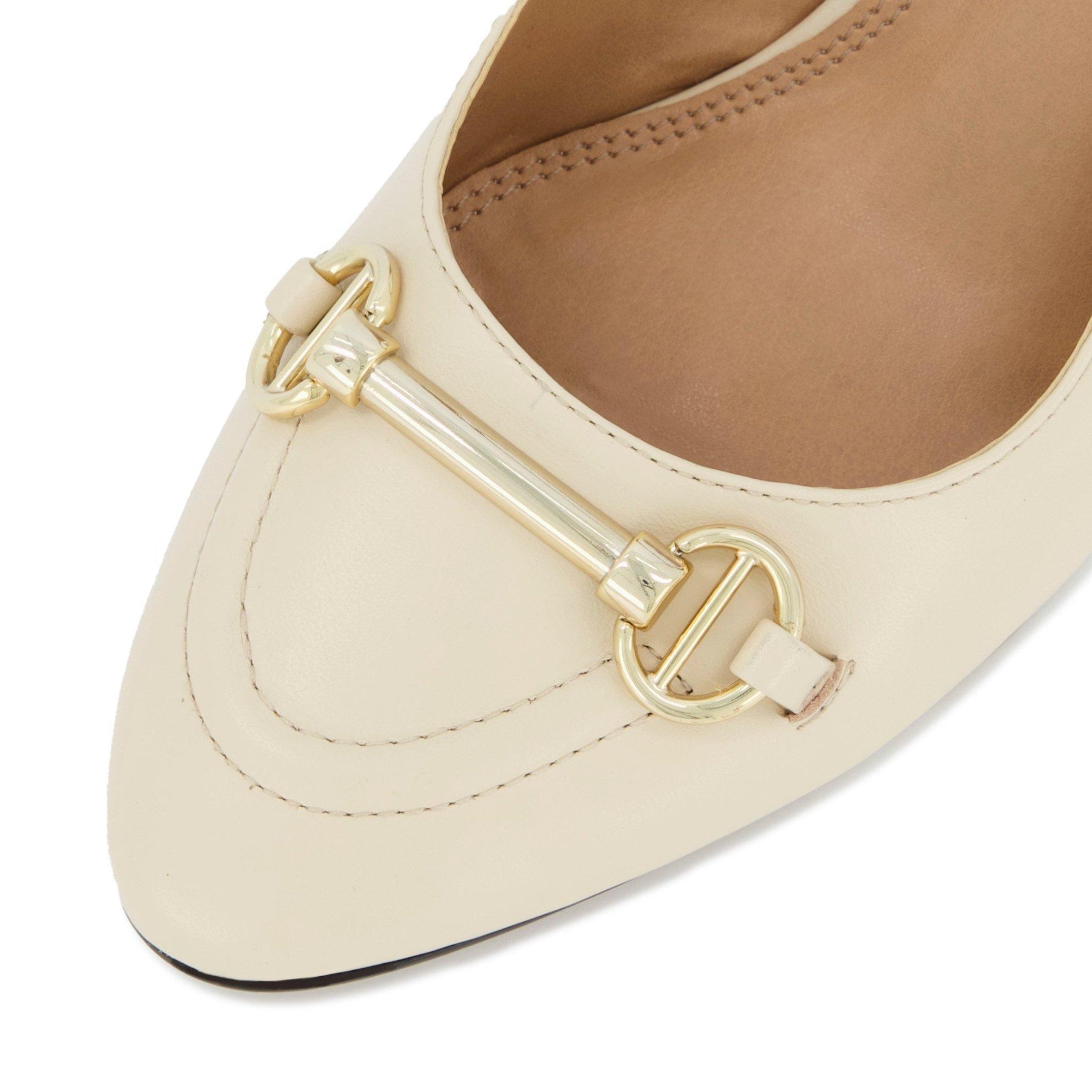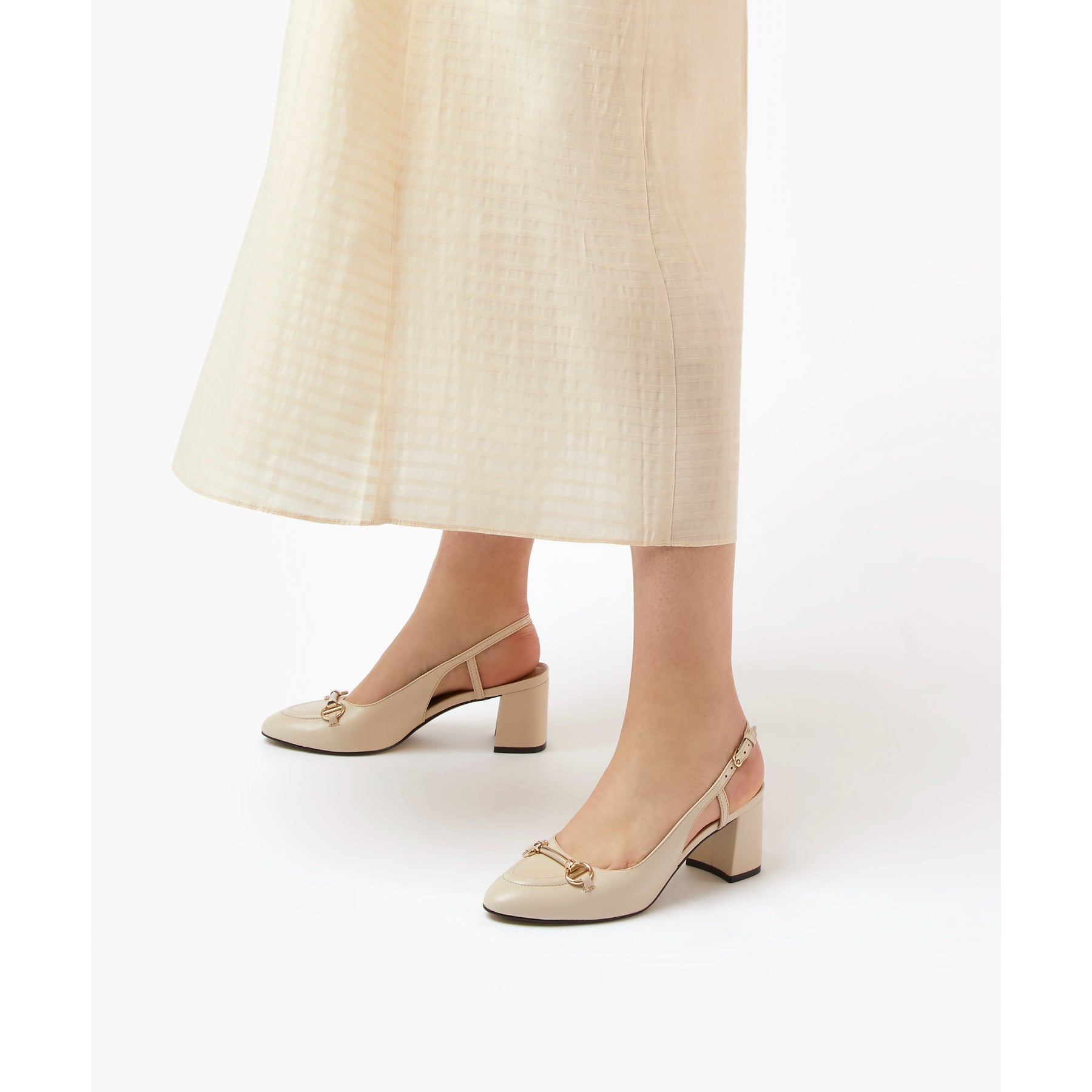 A sophisticated pair of sling back court Shoes with classic snaffle-detail design. Set on a wearable mid block heel the ladylike, feminine silhouette is Punctuated with gold hardware and an adjustable buckle on the ankle strap ensuring a perfect fit.