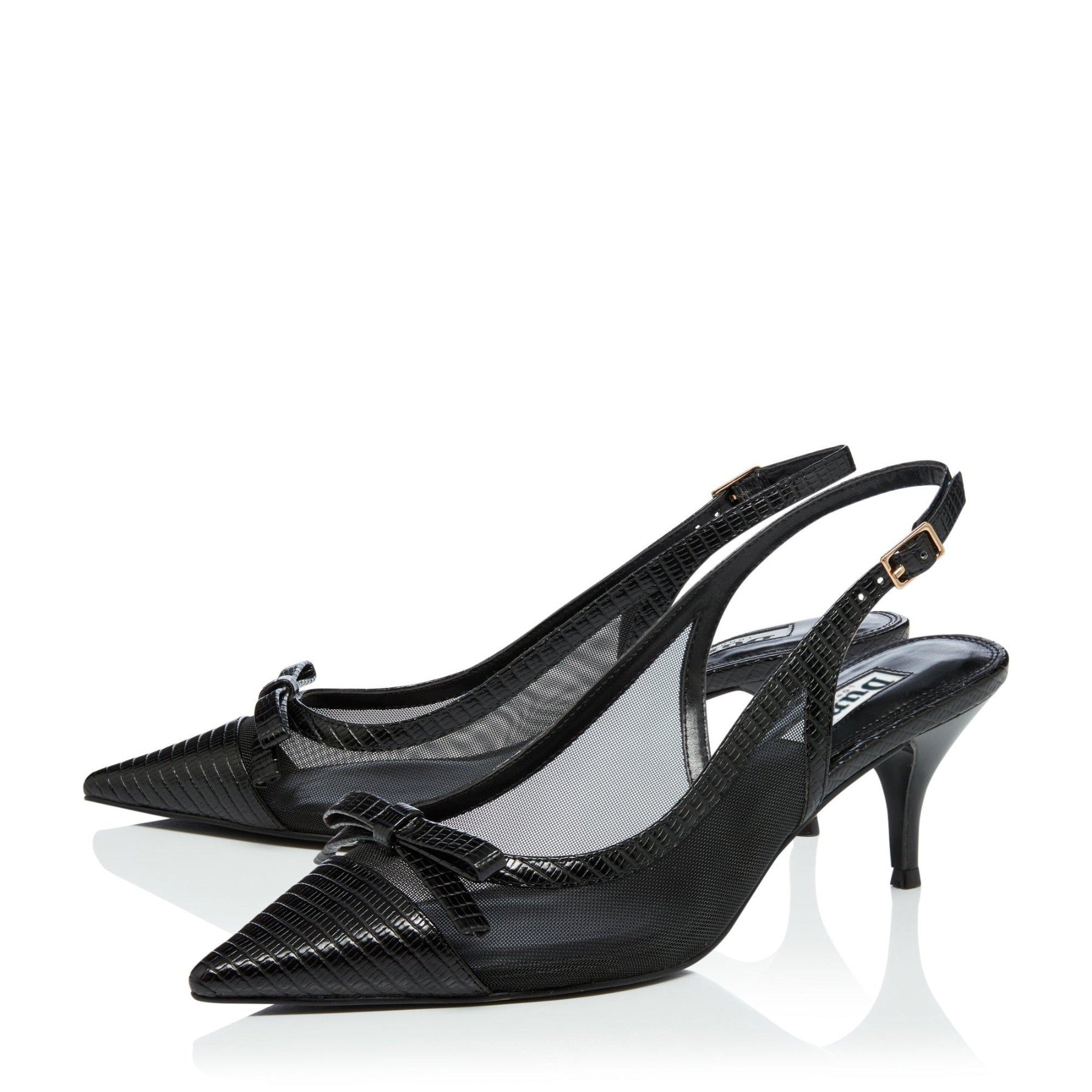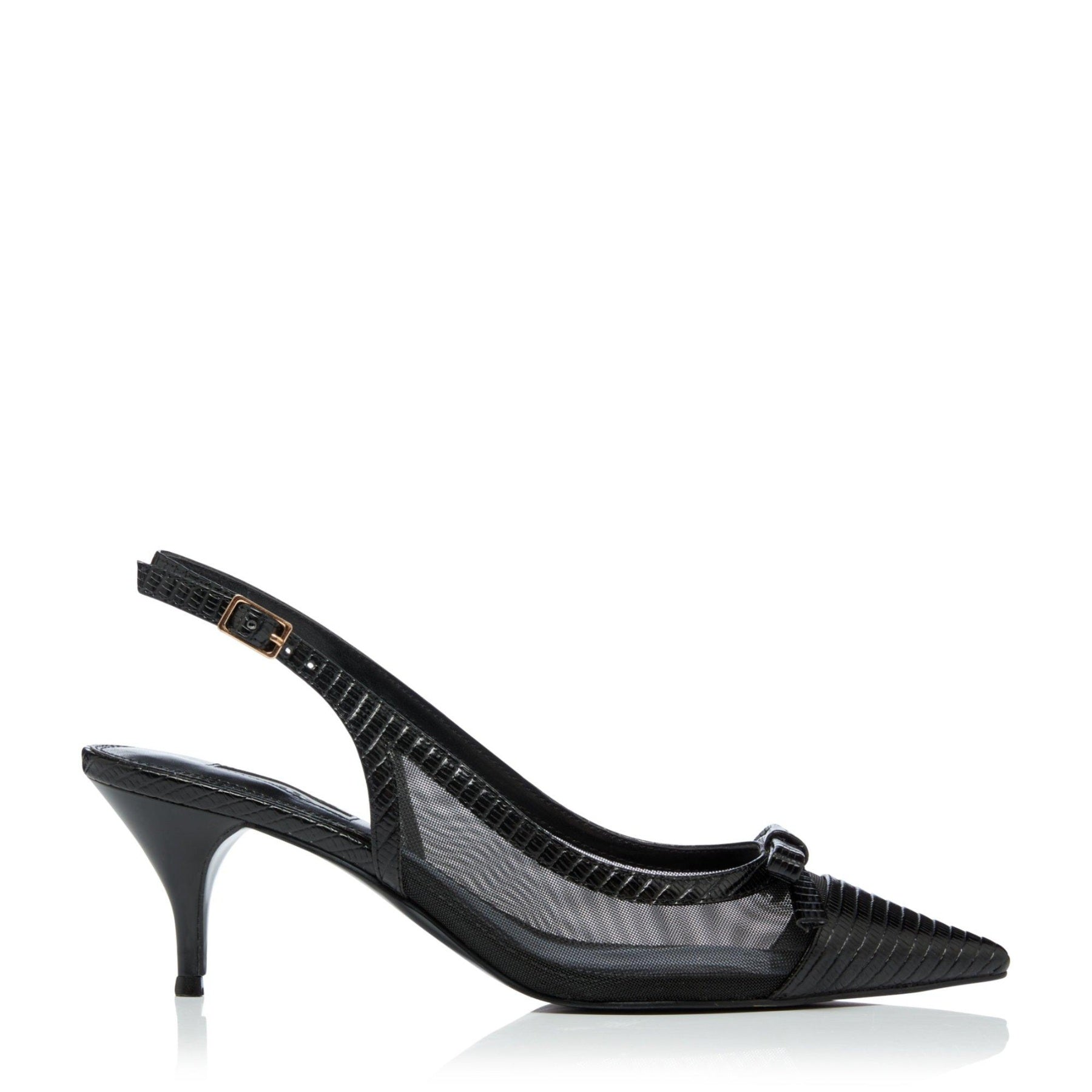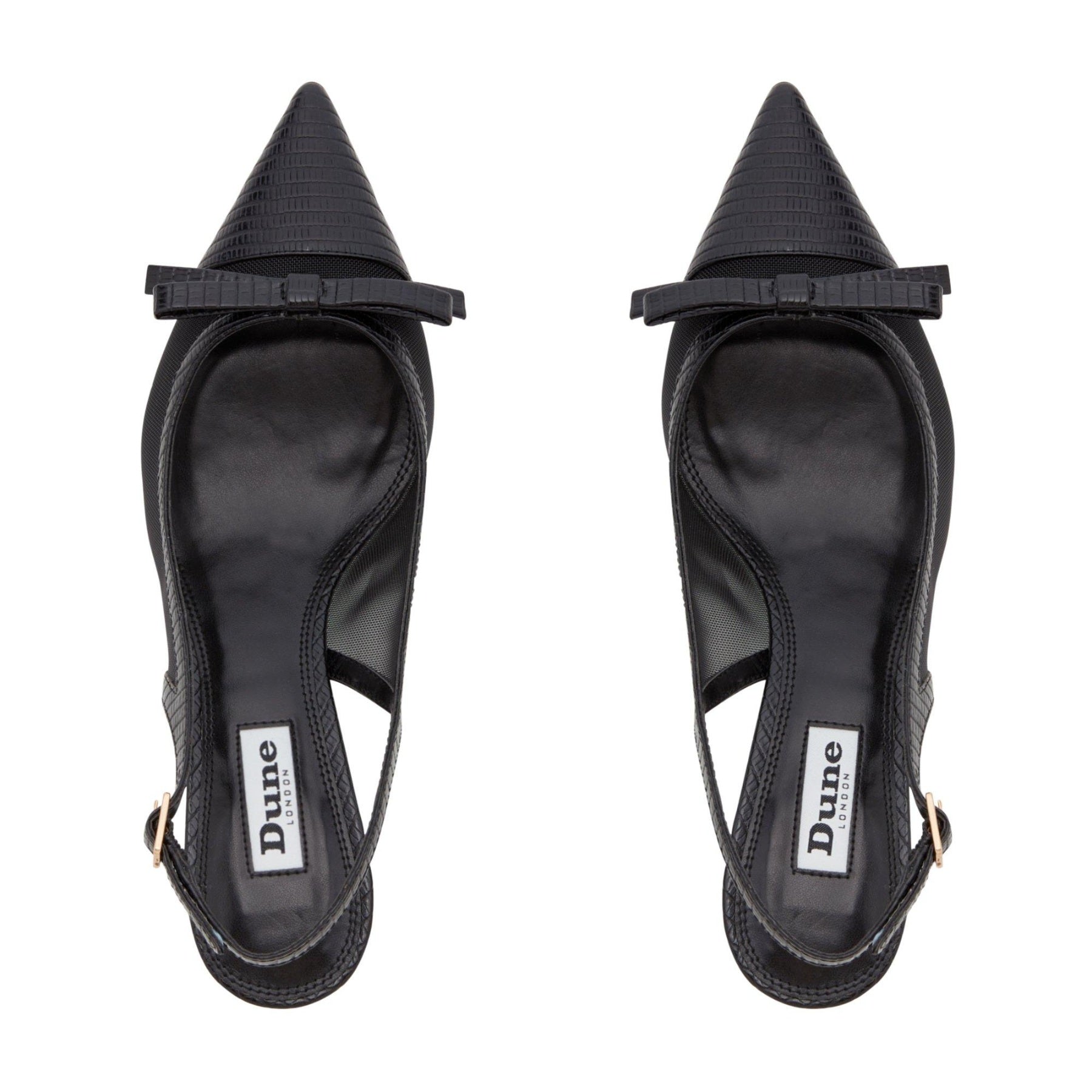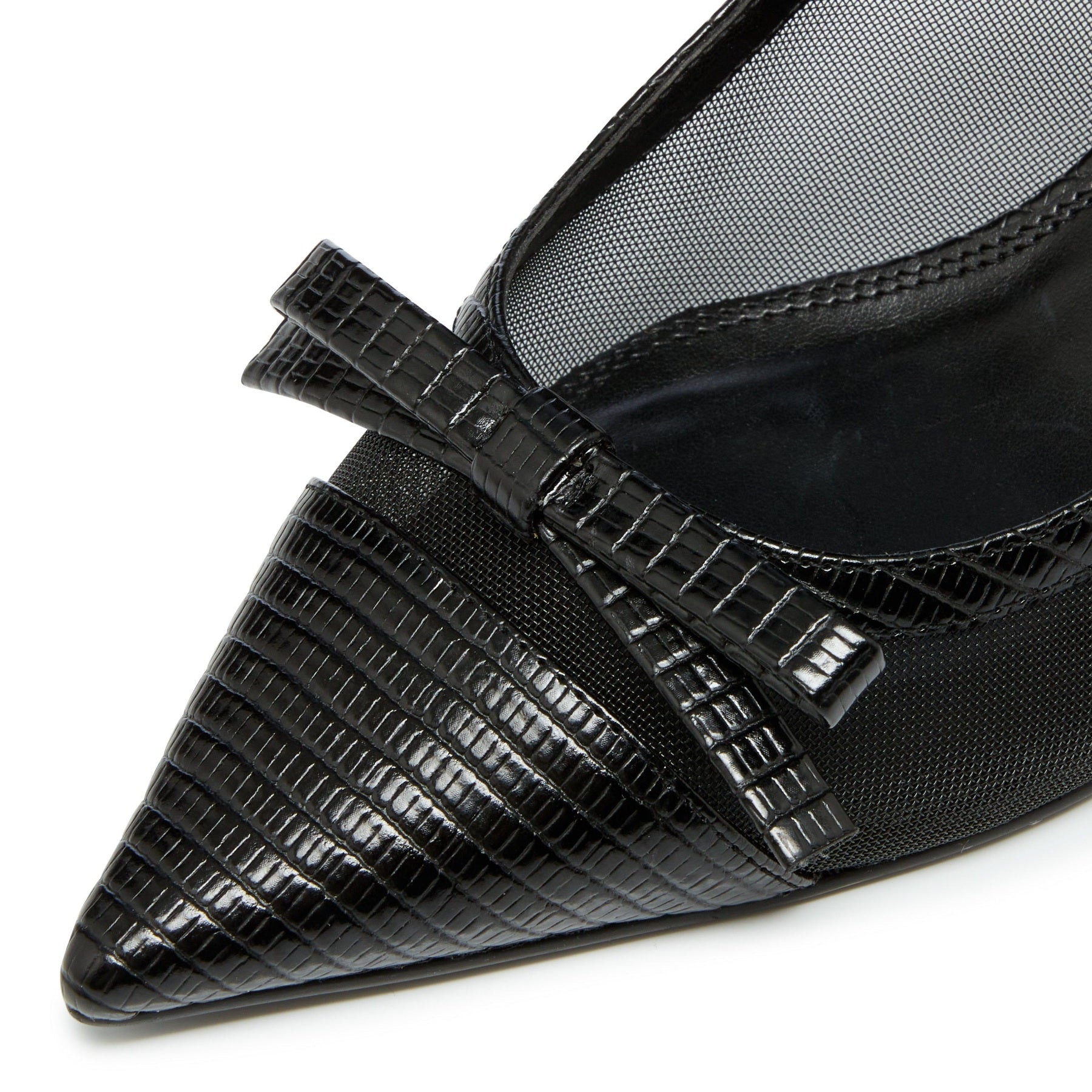 These will work wonders on any outfit. As kitten heels make a comeback go ultra feminine with the added bow. The textures and point toe add to the charm and they're easy to slip on.
