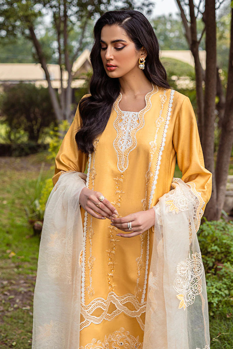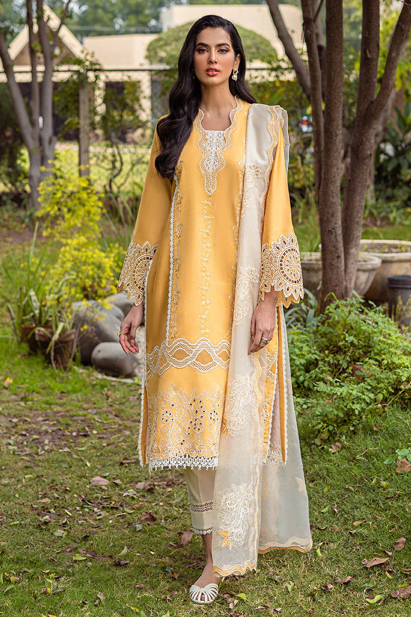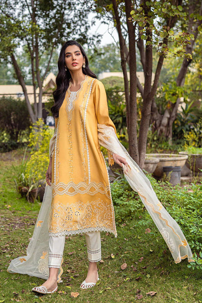Rendered in summery mango yellow, this outfit features intricate embroidery in ivory paisley motifs. Paired with an ivory organza dupatta and straight pants with lace finishing, this design will create a perfect summer look for you.