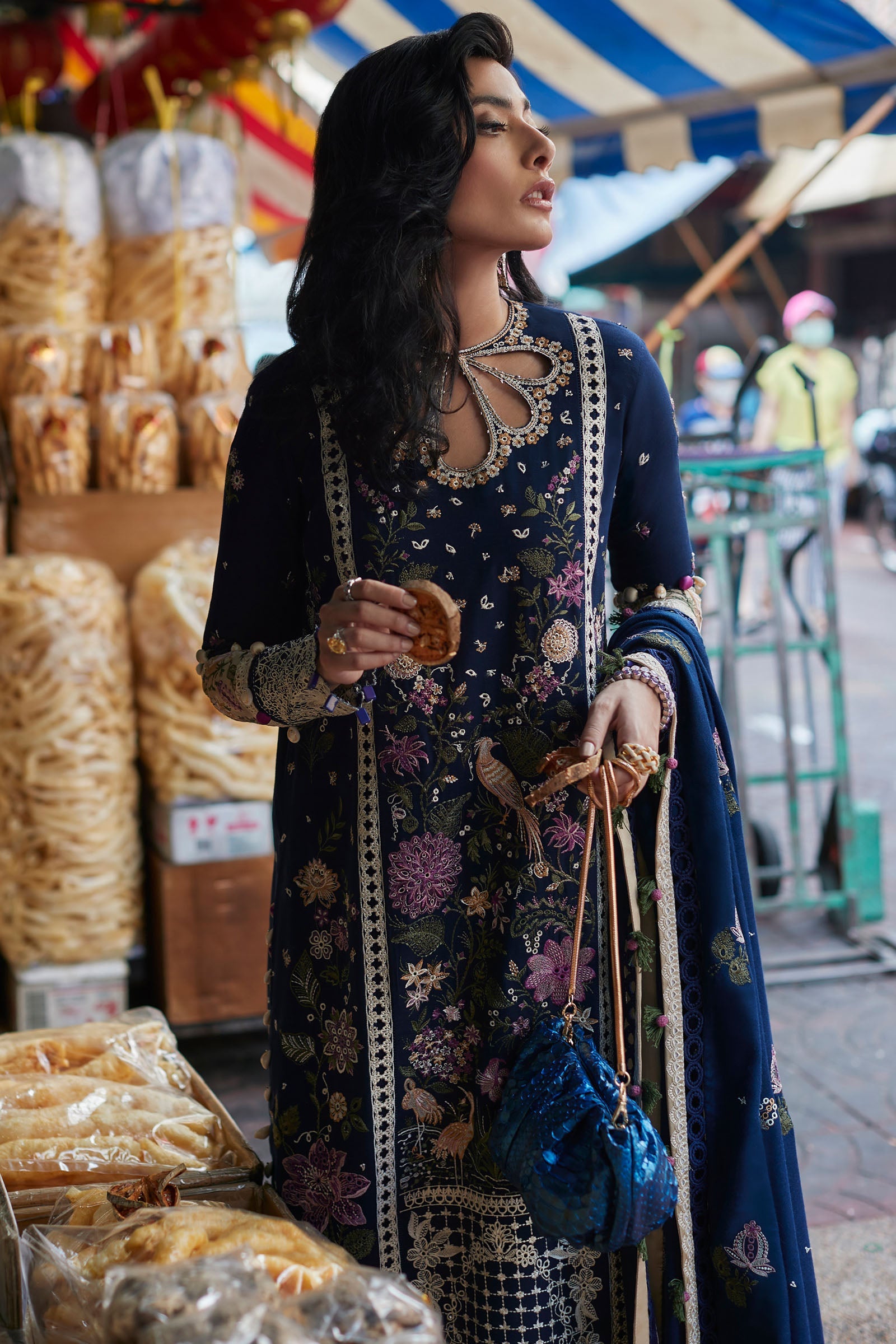 A riot of florets and birds makes for a sublime composition on a deep navy canvas in ‘Darien’. An exquisite tapestry is rendered using Élan's signature fine and detailed taankas in shades of ivory, lilac, sage, moss and oat. It is set off by a sumptuous woolen shawl adorned with embroidered motifs framed with a laboriously embroidered border on all sides. This look is crafted with ultra feminine twists, elevated textures and highly luxurious accent to help you float through the winter season with greatest of ease.