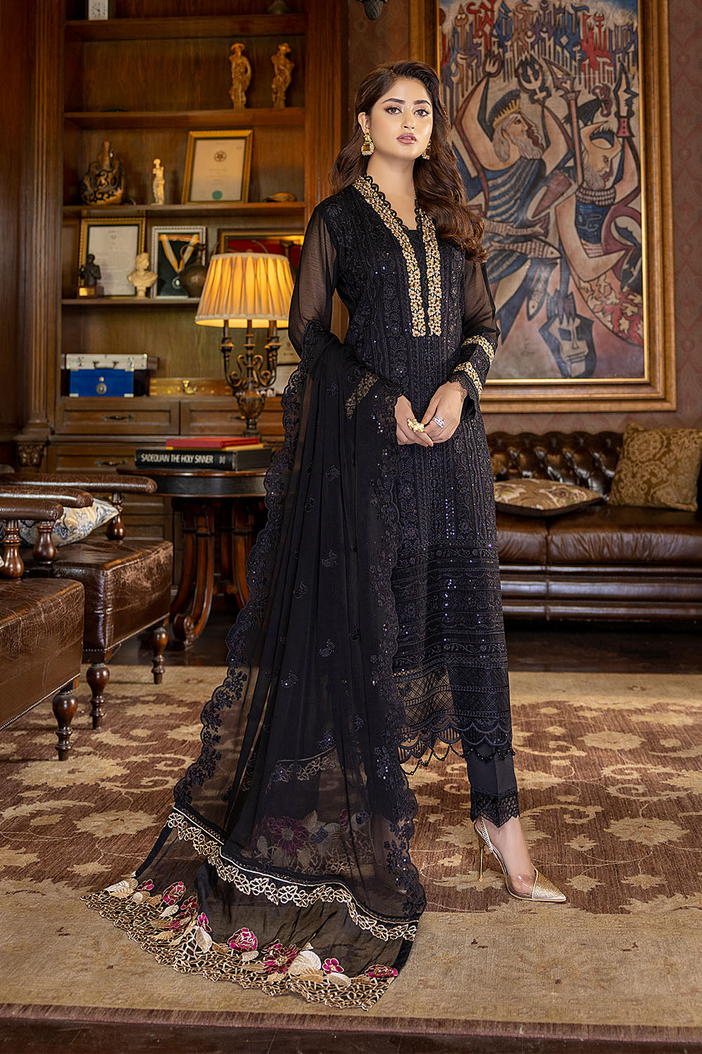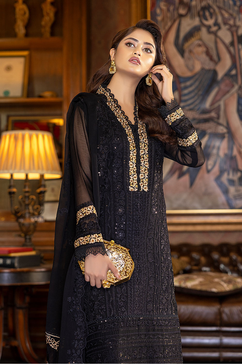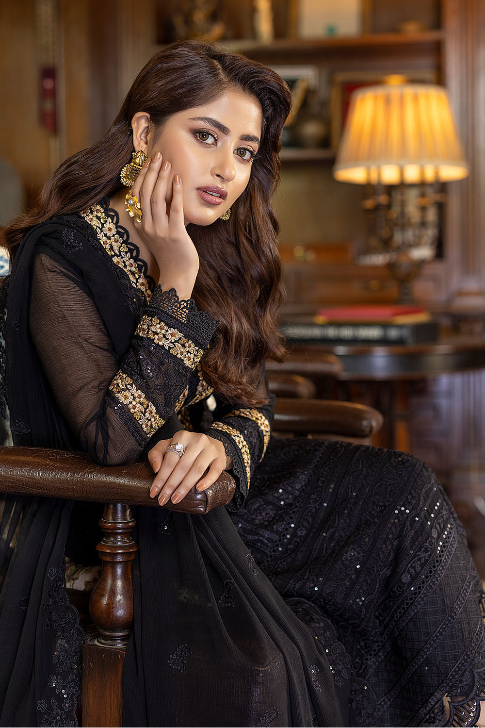 Gorgeous midnight ensemble rendered on chiffon base with intricate sequins embroidery. (The article is stitched as it is displayed. Laces may vary. The sleeves lining comes with the product and can be attached if needed.)