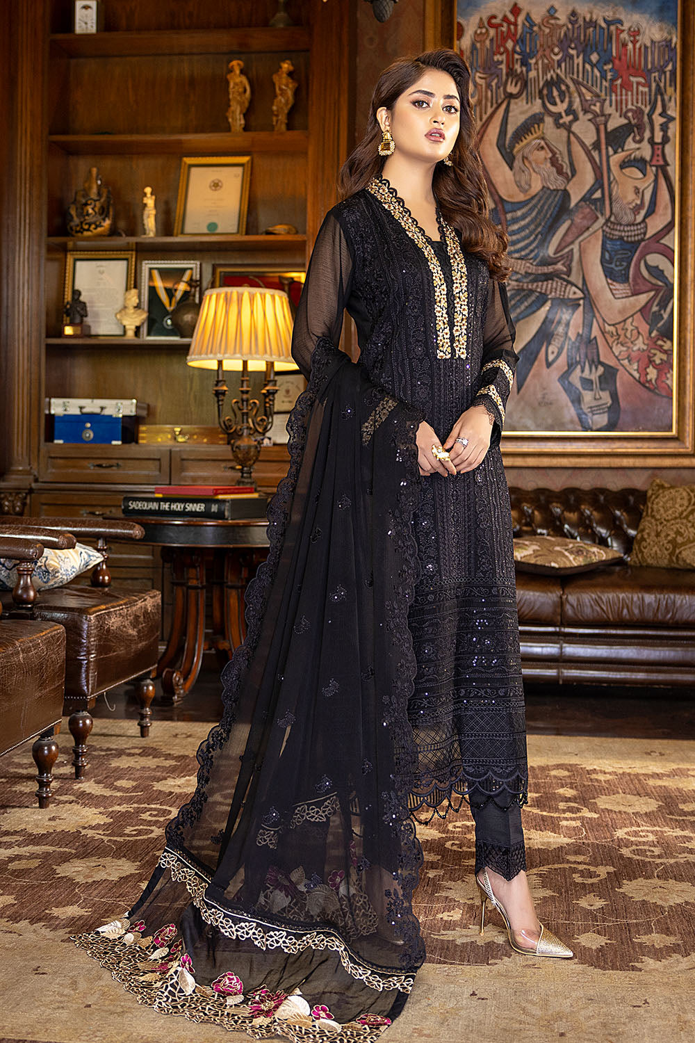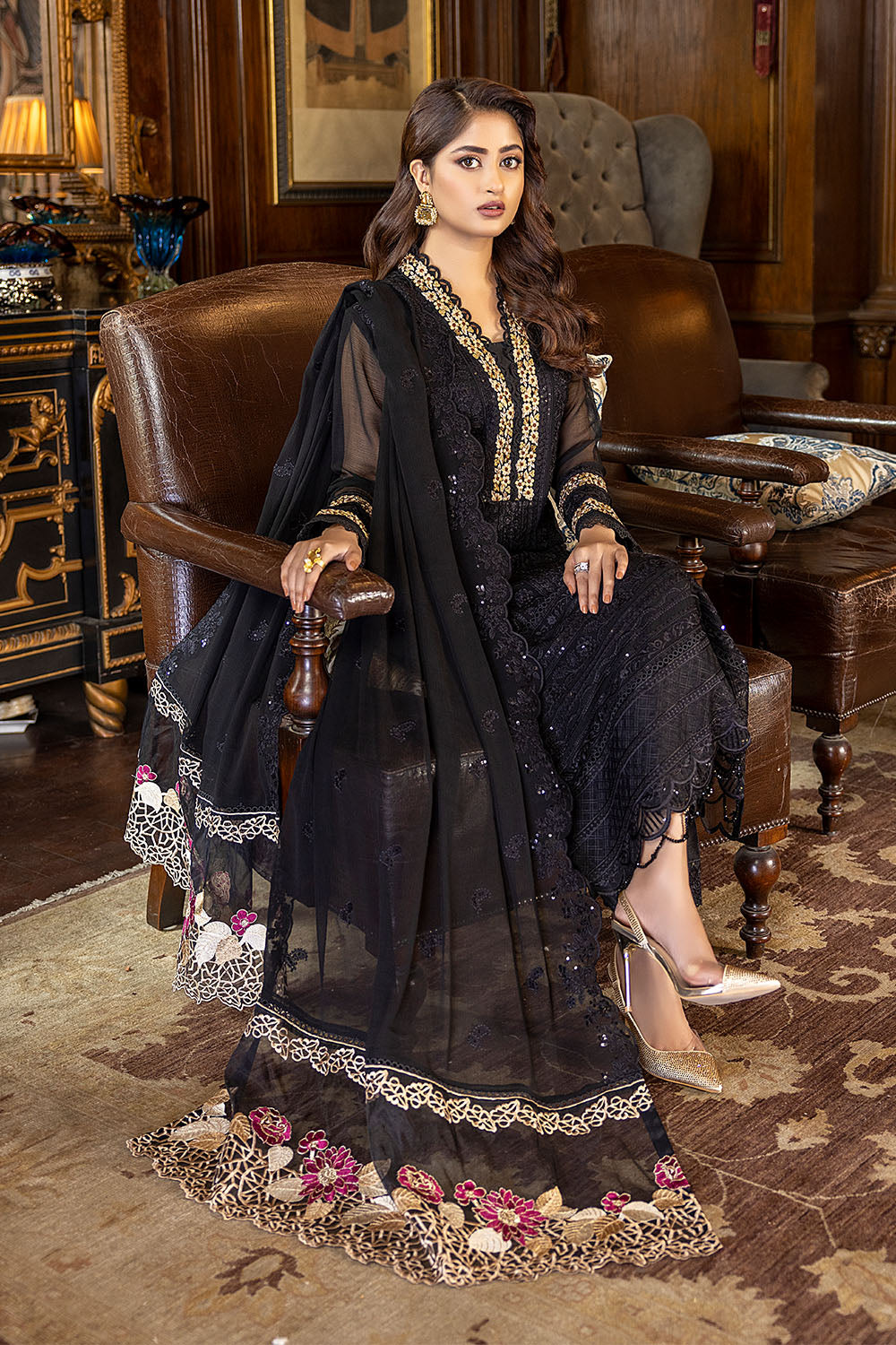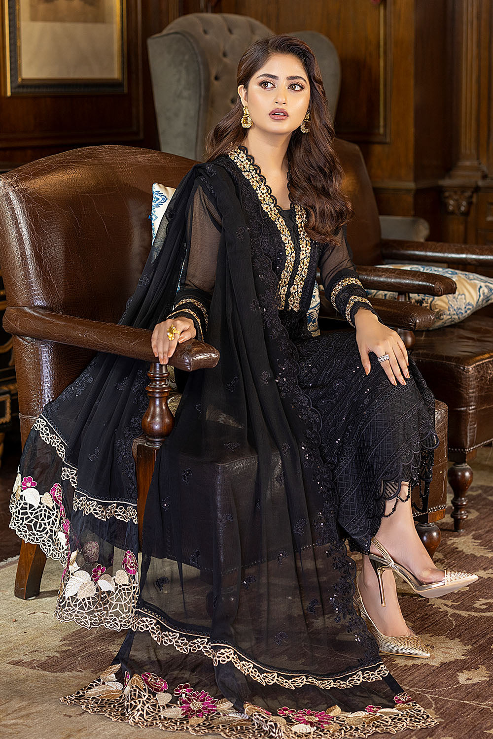 Gorgeous midnight ensemble rendered on chiffon base with intricate sequins embroidery. (The article is stitched as it is displayed. Laces may vary. The sleeves lining comes with the product and can be attached if needed.)