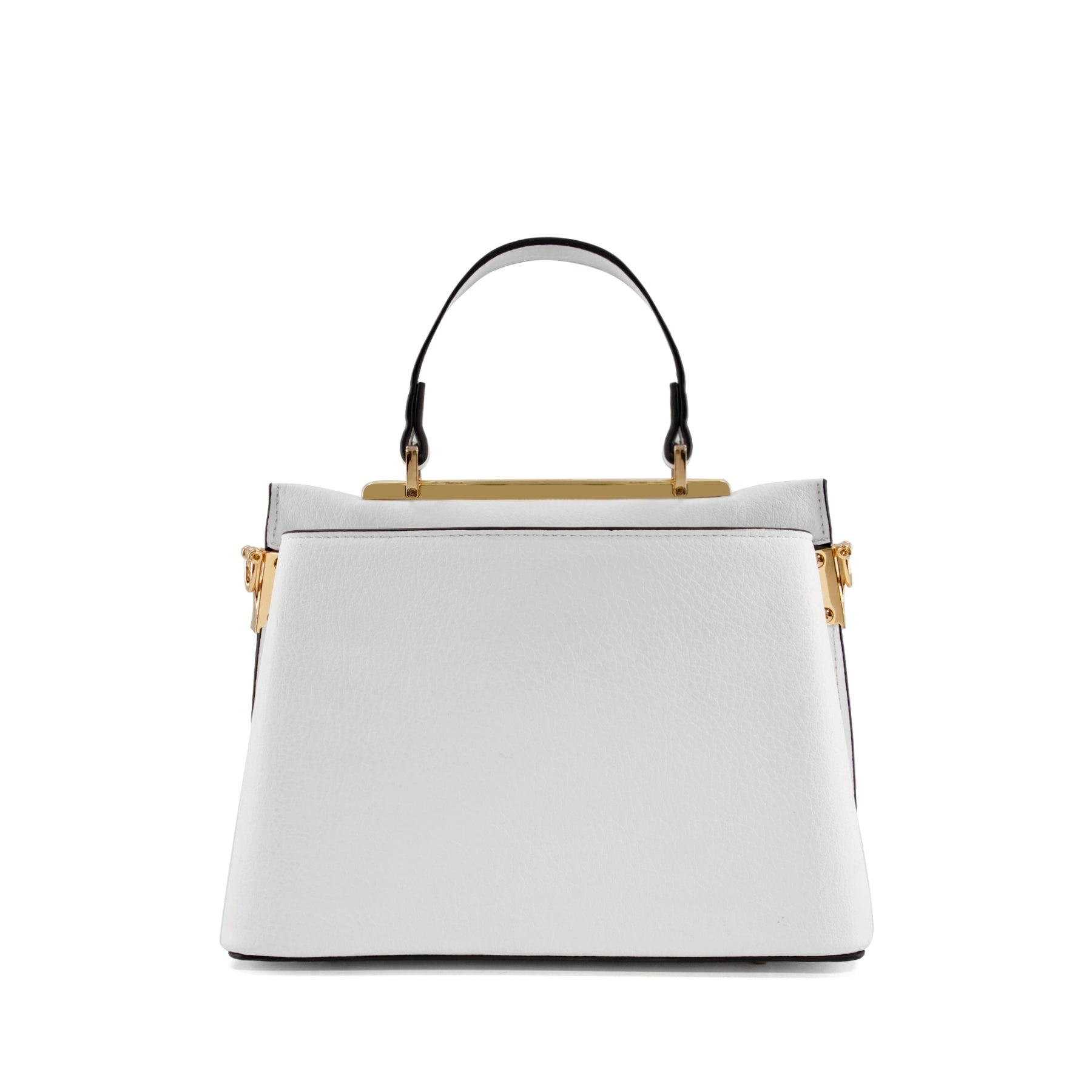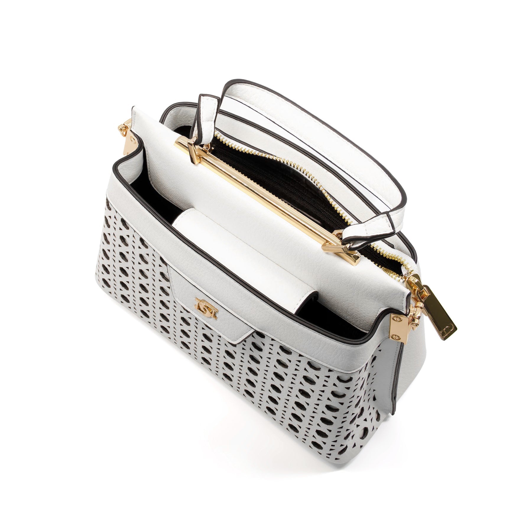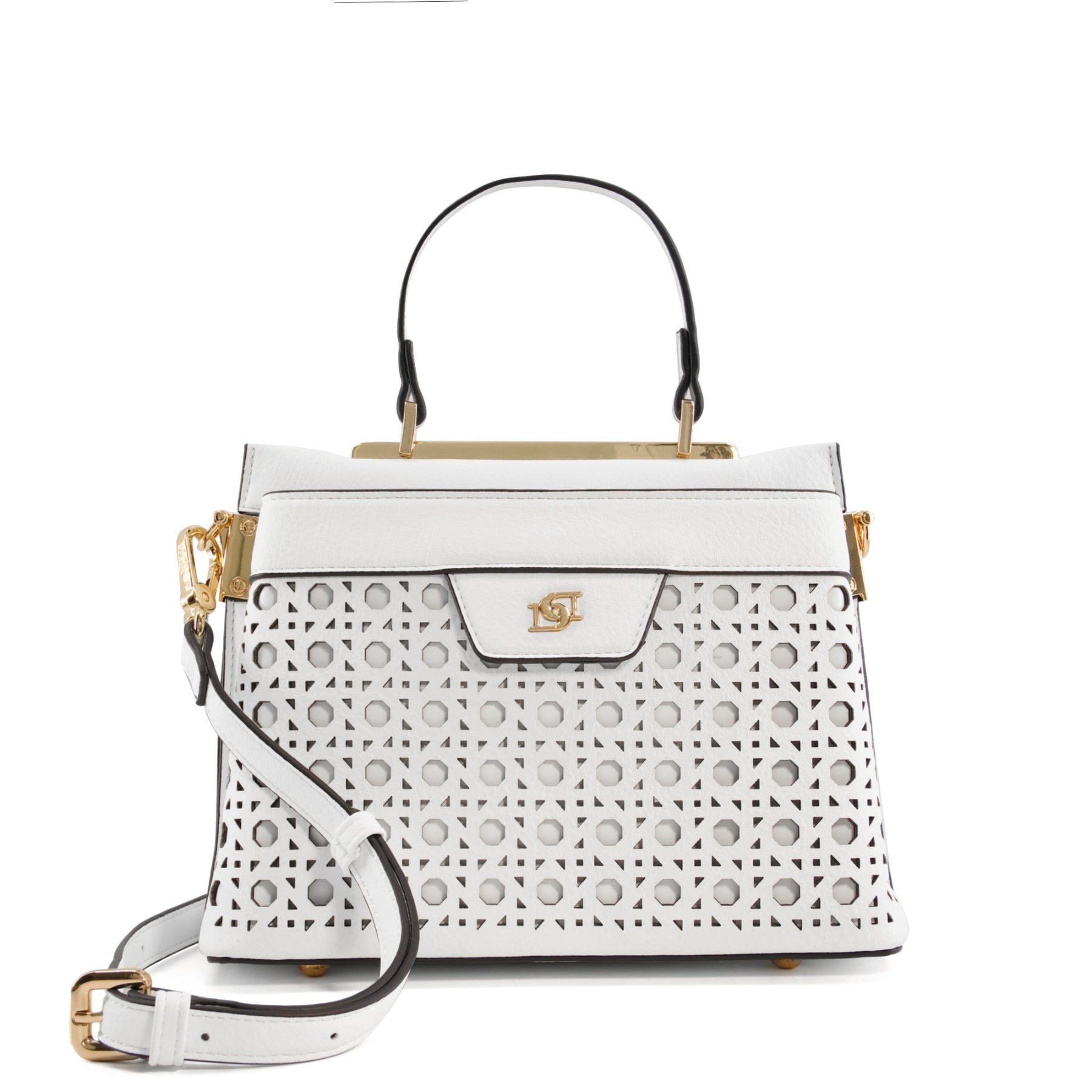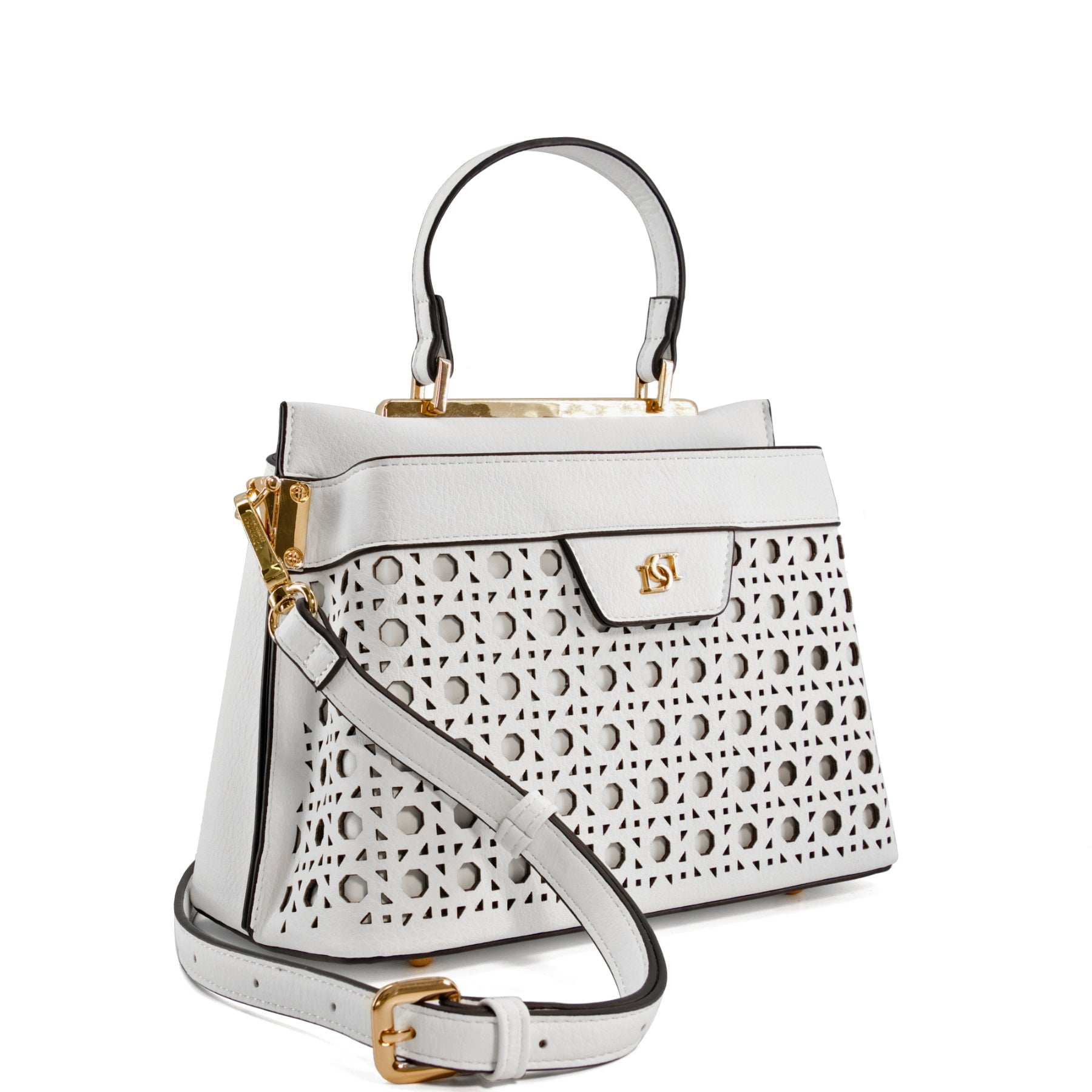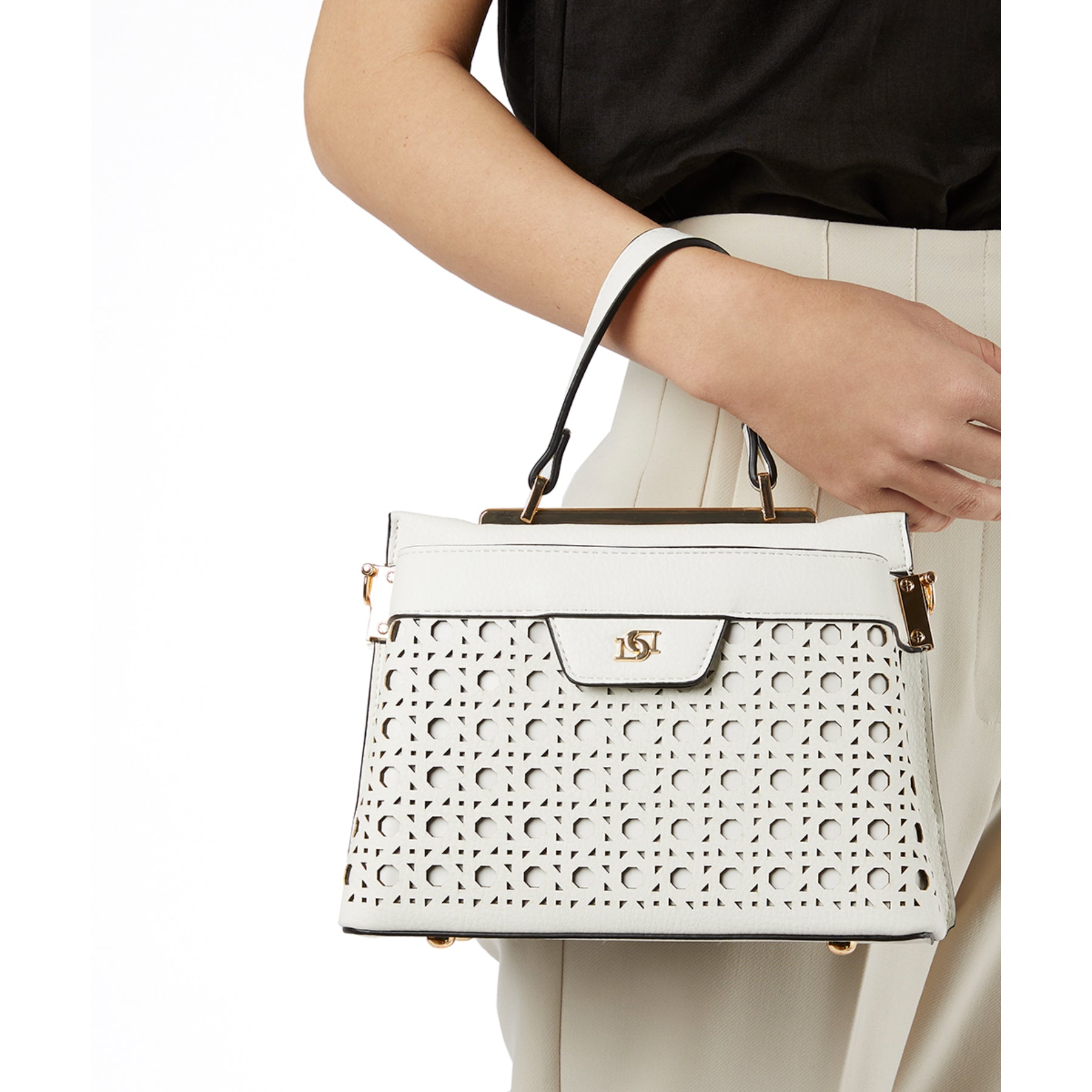 This chic style is made from matte faux Leather with a laser-cut panel and burnished gold details. Ideal for weekend shopping trips, it features a top handle and an adjustable cross-body strap.