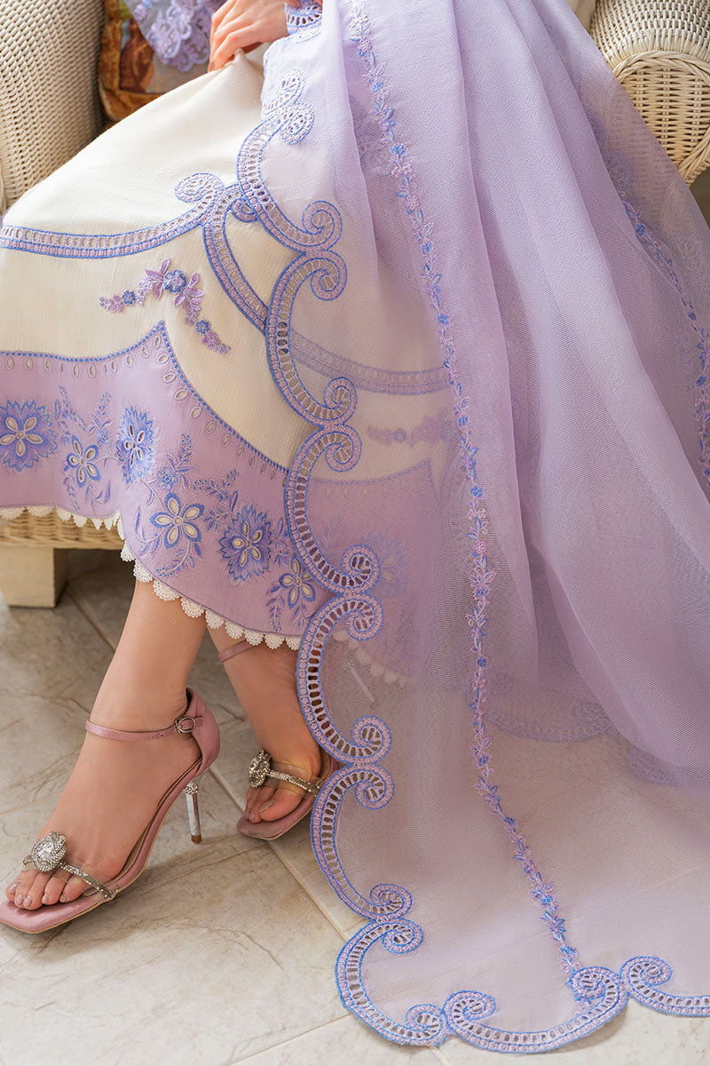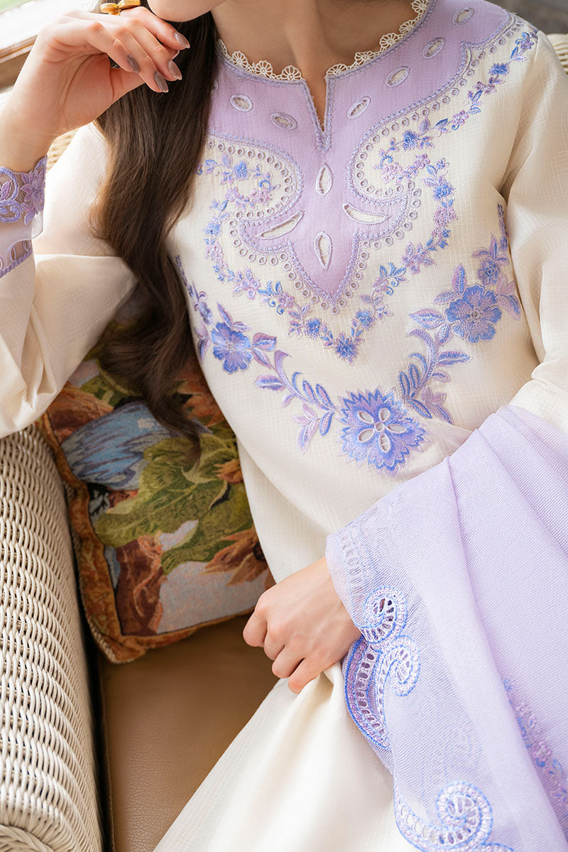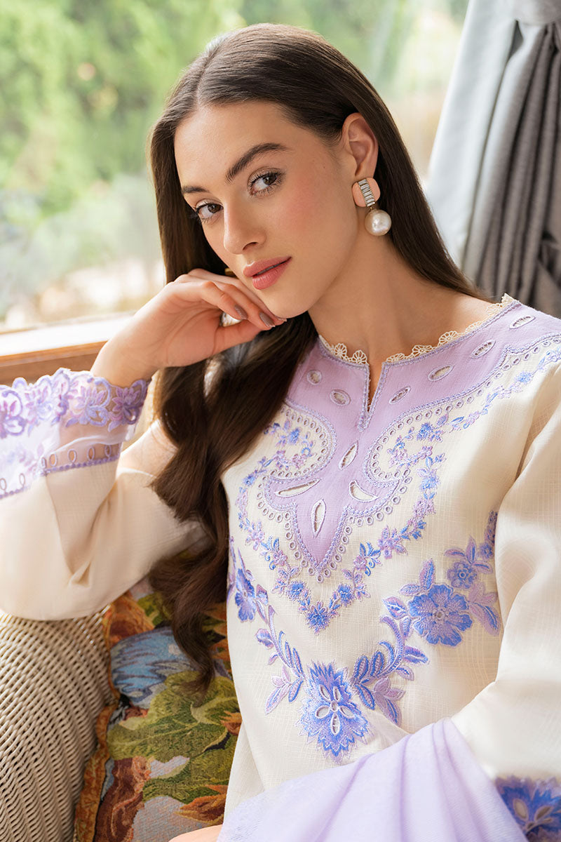 Embrace your inner DIVA with this urbane beige ensemble. The cotton shirt features blue and purple floral eyelets and embroidery that are fit for a queen. The lilac organza net dupatta with a laser-cut blue and purple border is the perfect complement to the stunning shirt and trouser combo.