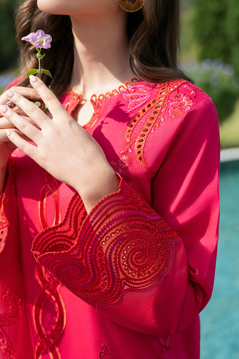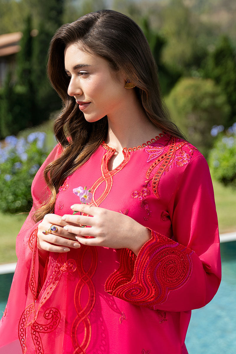 Prepare to be swept away by the enchanting allure of DOSE OF ROSE. This delightful watermelon pink ensemble features a mesmerizing cotton shirt with eyelets and spiral/floral embroidery, paired with a trouser blend. The organza dupatta is the perfect finishing touch, adding a touch of class to this stunning outfit.