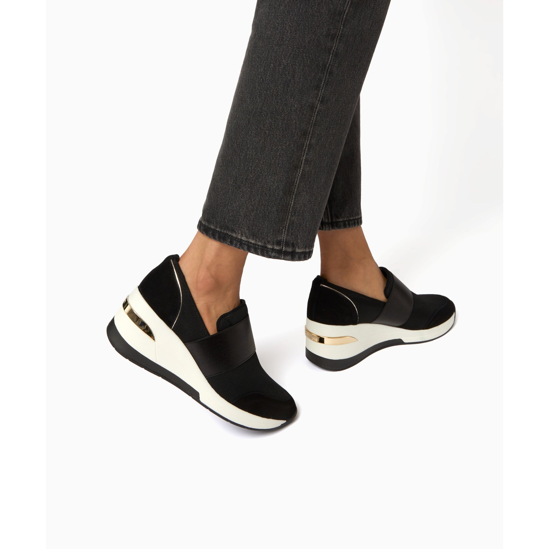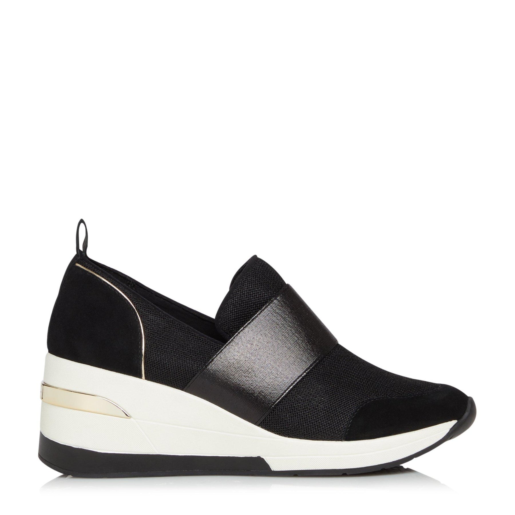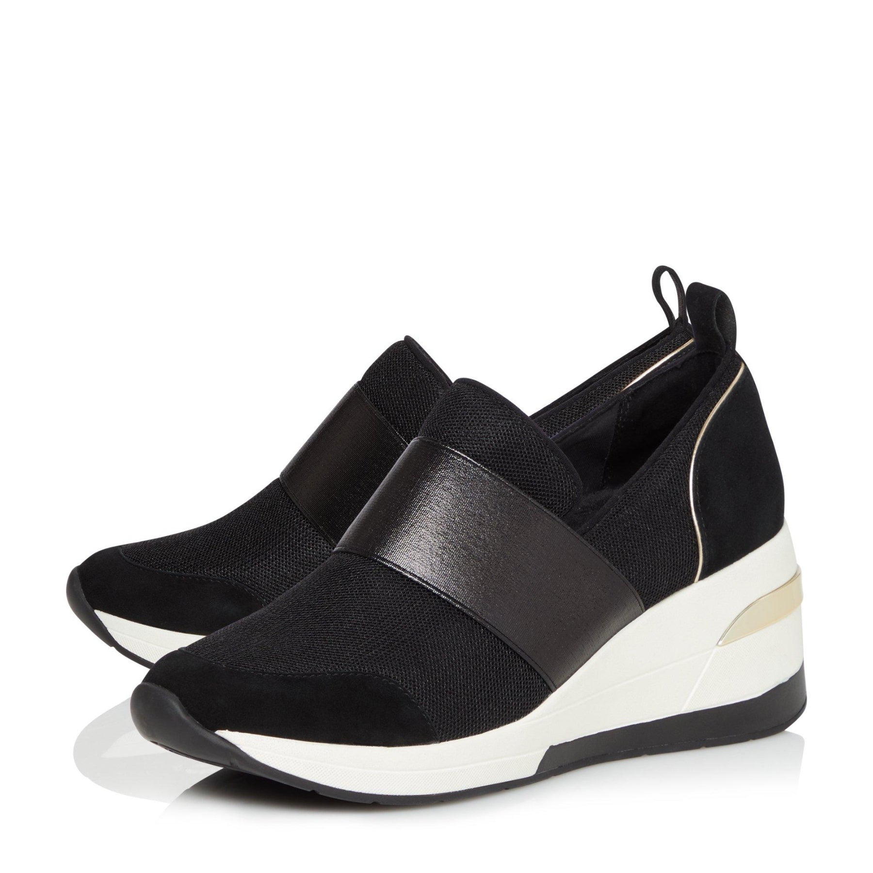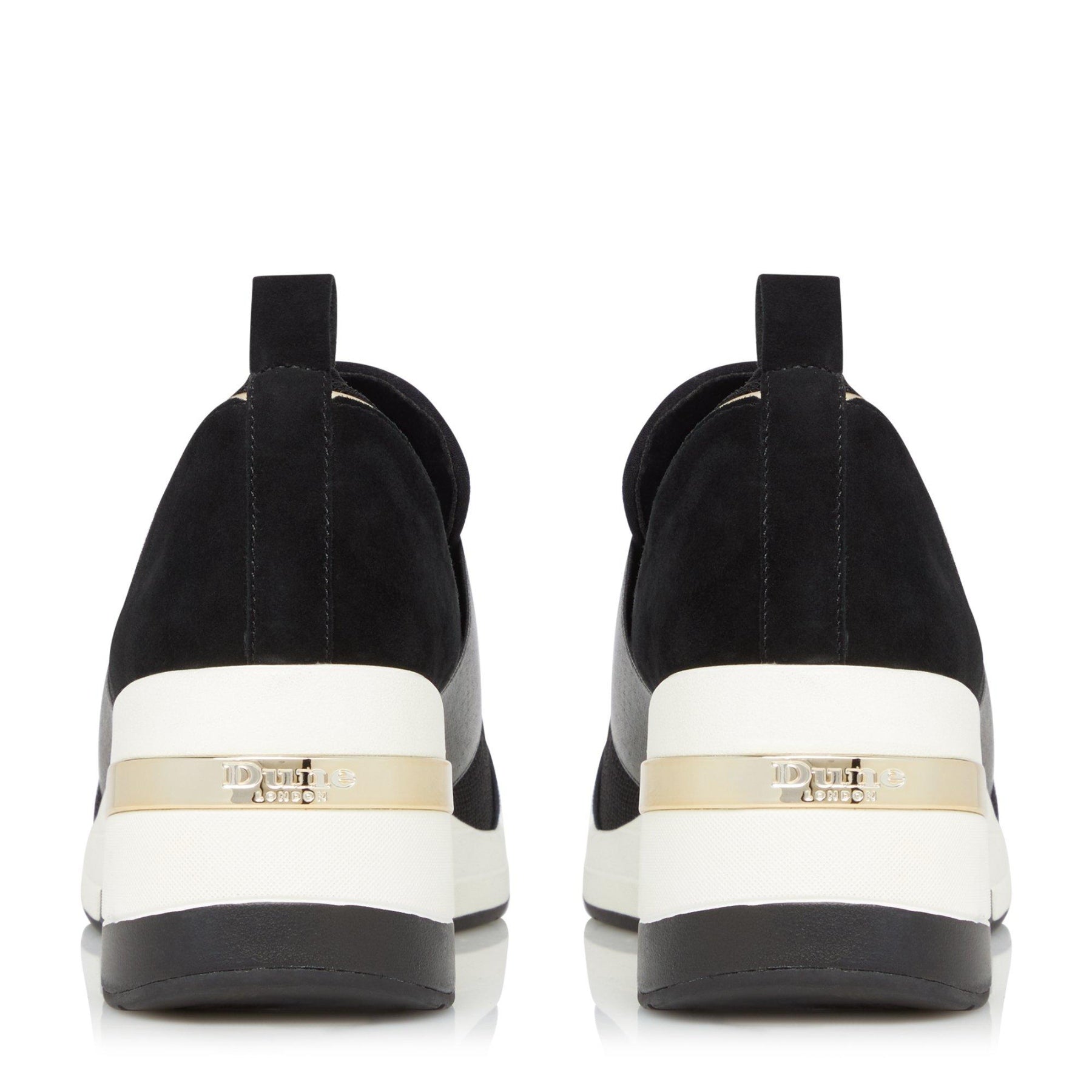 Sports meet luxe with the stylish Emillia trainer from Dune London. Set on a chunky wedge sole and accented with polished hardware. They're fitted with an elasticated strap pull-up tab and an almond toe.