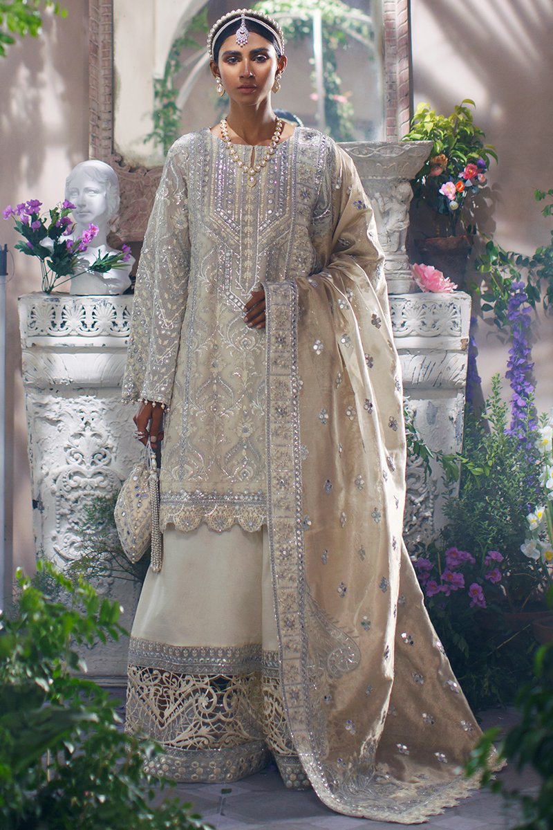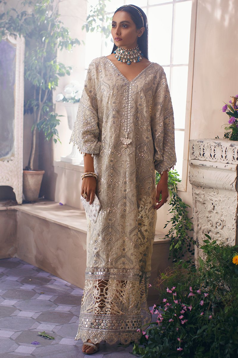 Ivory Empress is a dreamy chiffon outfit that can be styled as a kaftan or a simple kurti. The shirt is crafted with intricate thread work & tilla embroidery along with carefully placed mirror work. A bold cut worked border and a mirror worked Gold Tissue dupatta complete the look for this guaranteed head turner.