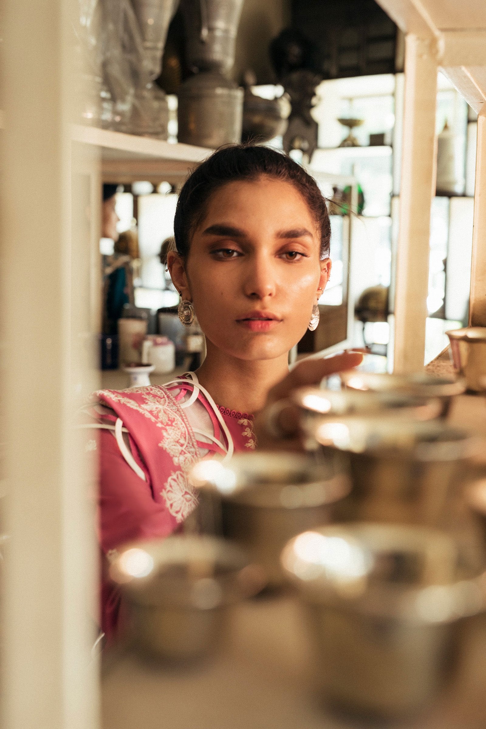 A sumptuous taffy pink khaddar is artfully illustrated with intricate embroidery depicting lush flora in bloom in ‘Manijeh.’ Accompanied by our cozy and artistic woollen blend chaddar, this sophisticated design epitomizes refined elegance.
