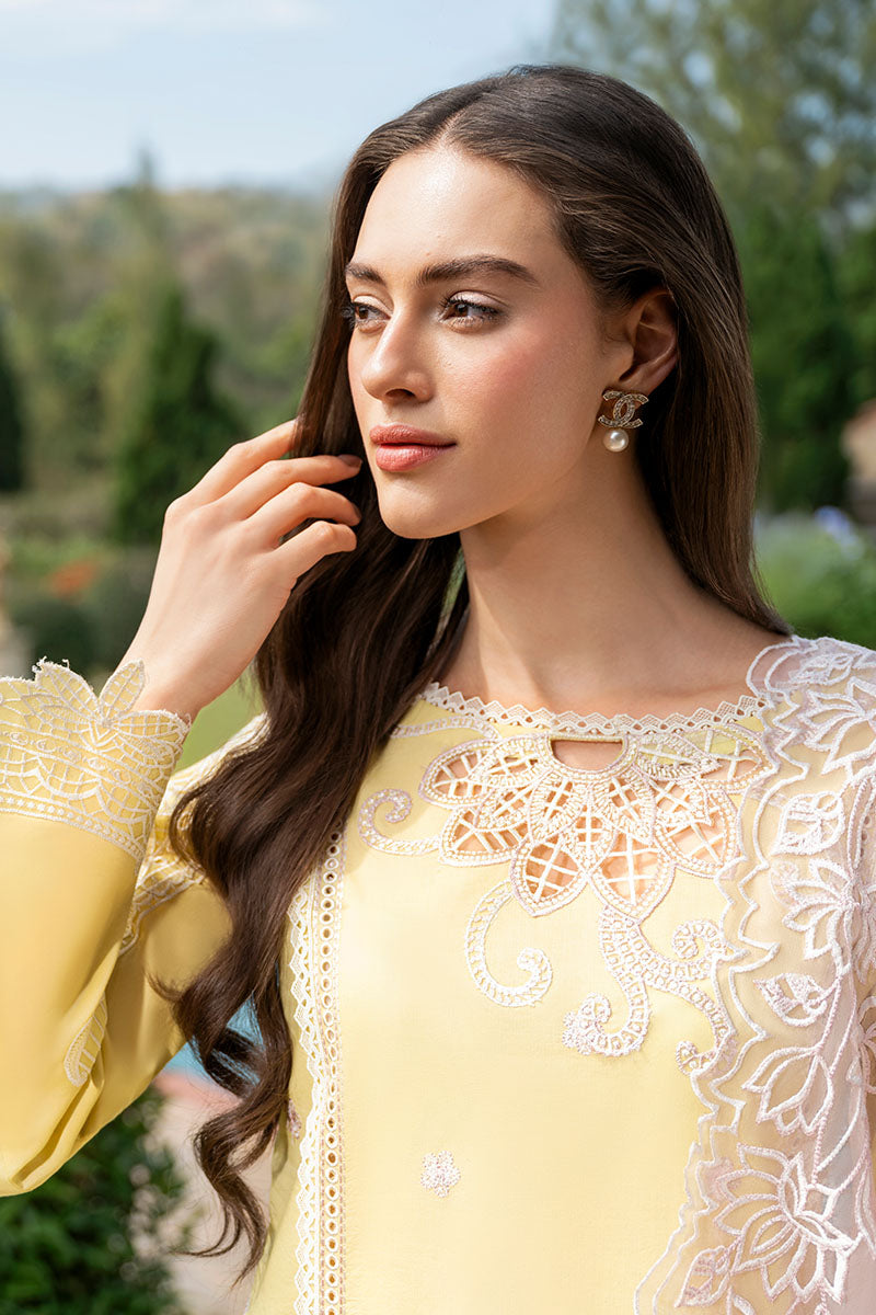 A vision of resplendent elegance, MELTDOWN features a radiant light yellow cotton shirt and trouser ensemble paired with a breathtaking organza dupatta. The dupatta features ethereal floral patches that will leave you utterly spellbound.