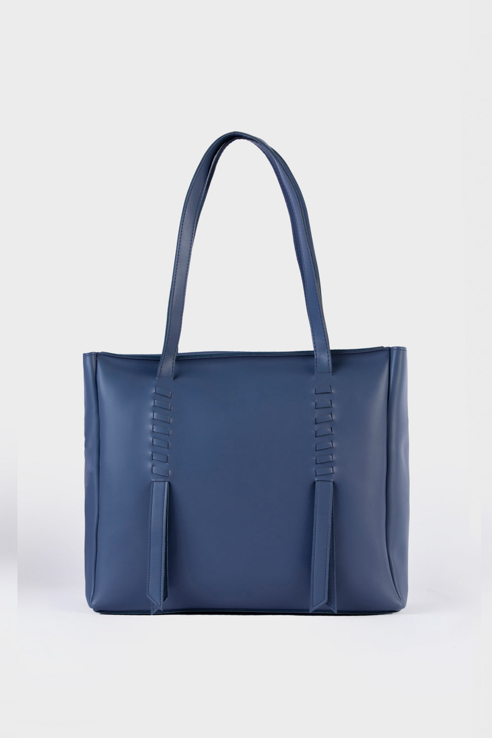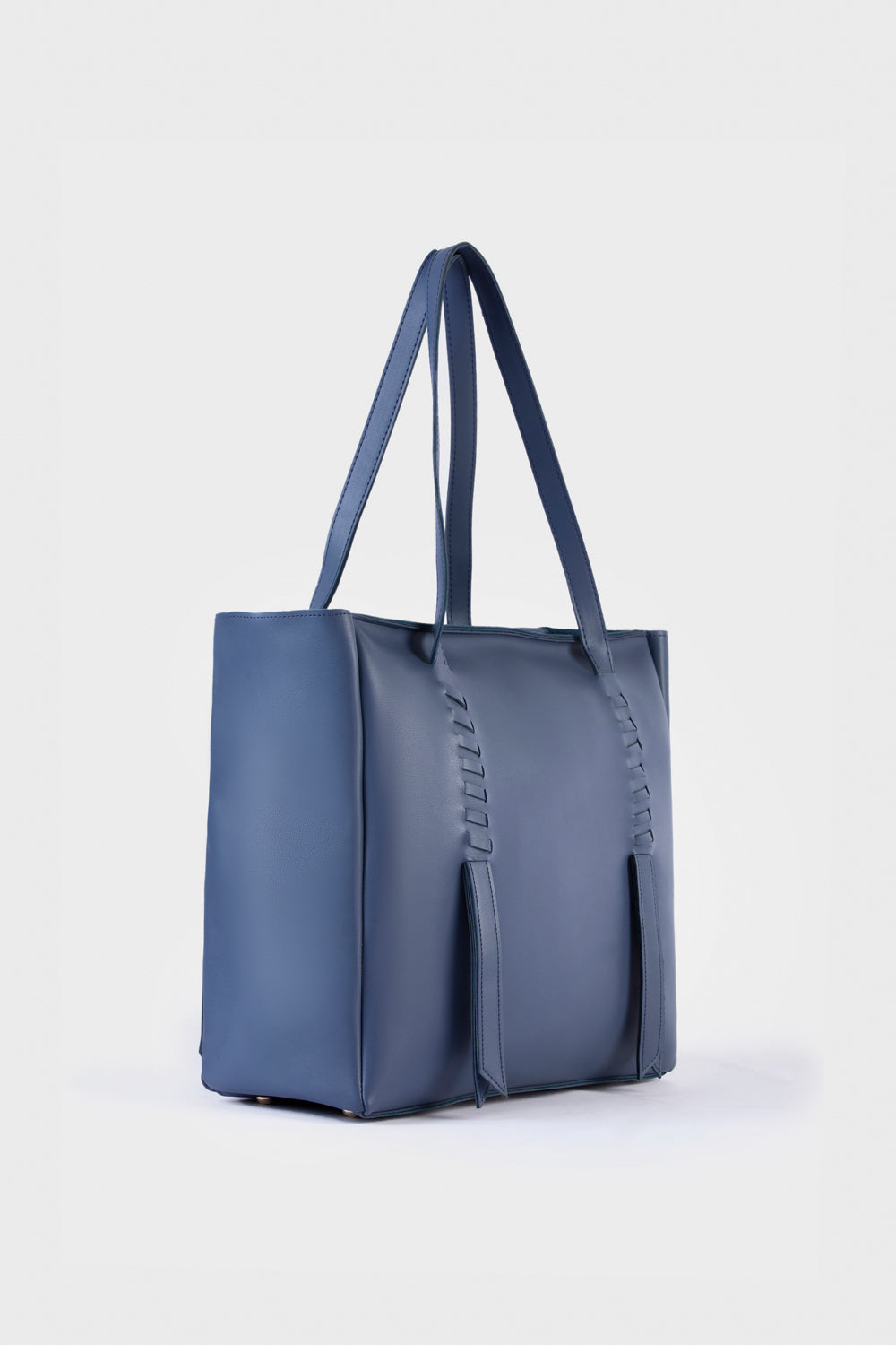 Level up your look with this spacious and stylish tote in PU material, imbued in a navy colour with short straps and tassels.