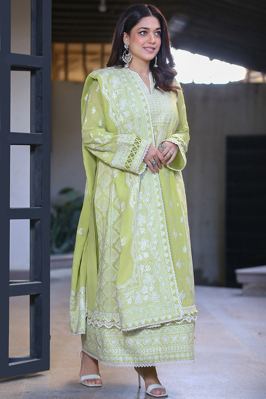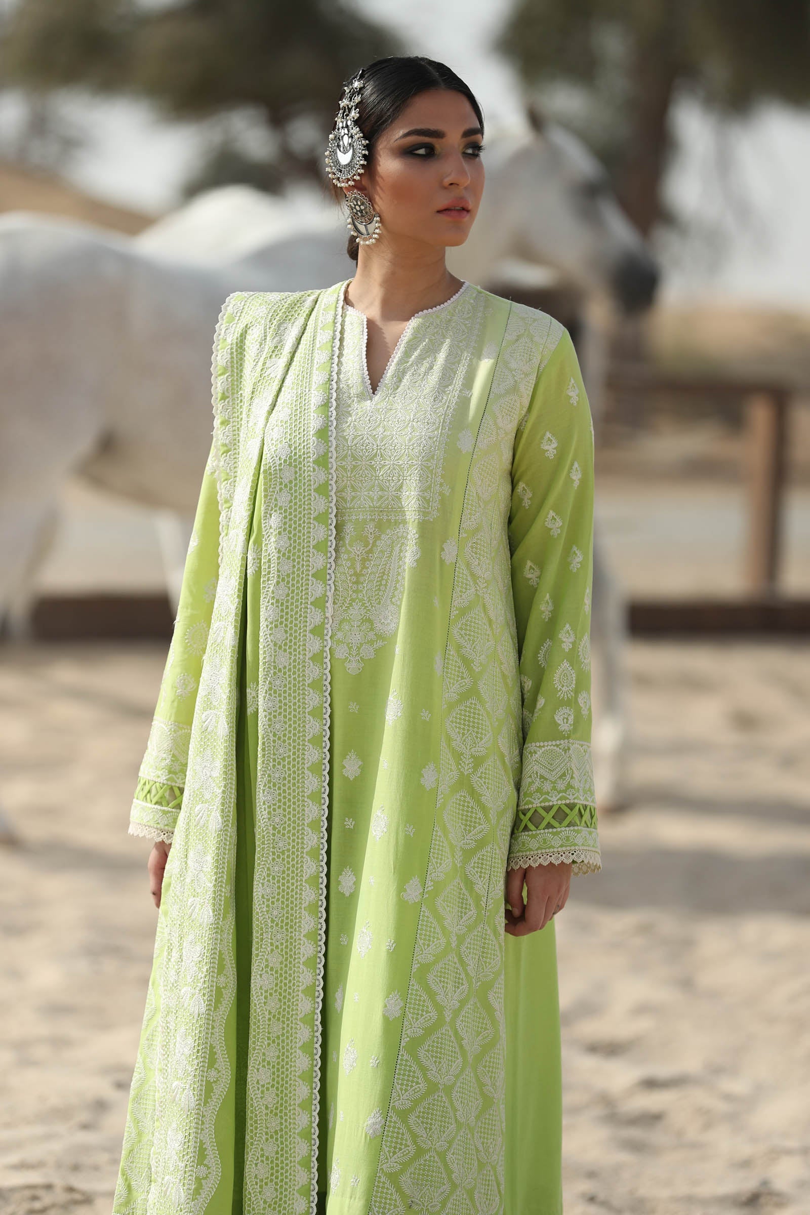 A bang on trend, tantalising tone of apple green gleams with wistful chickenkari ivory embroideries in the flowy kalidar. Paired with an exquisitely elaborate embroidered dupatta and tonal trousers, this light and floaty design has all the ingredients to ensure you’re cool as a cucumber during the hot and steamy summer days ahead.