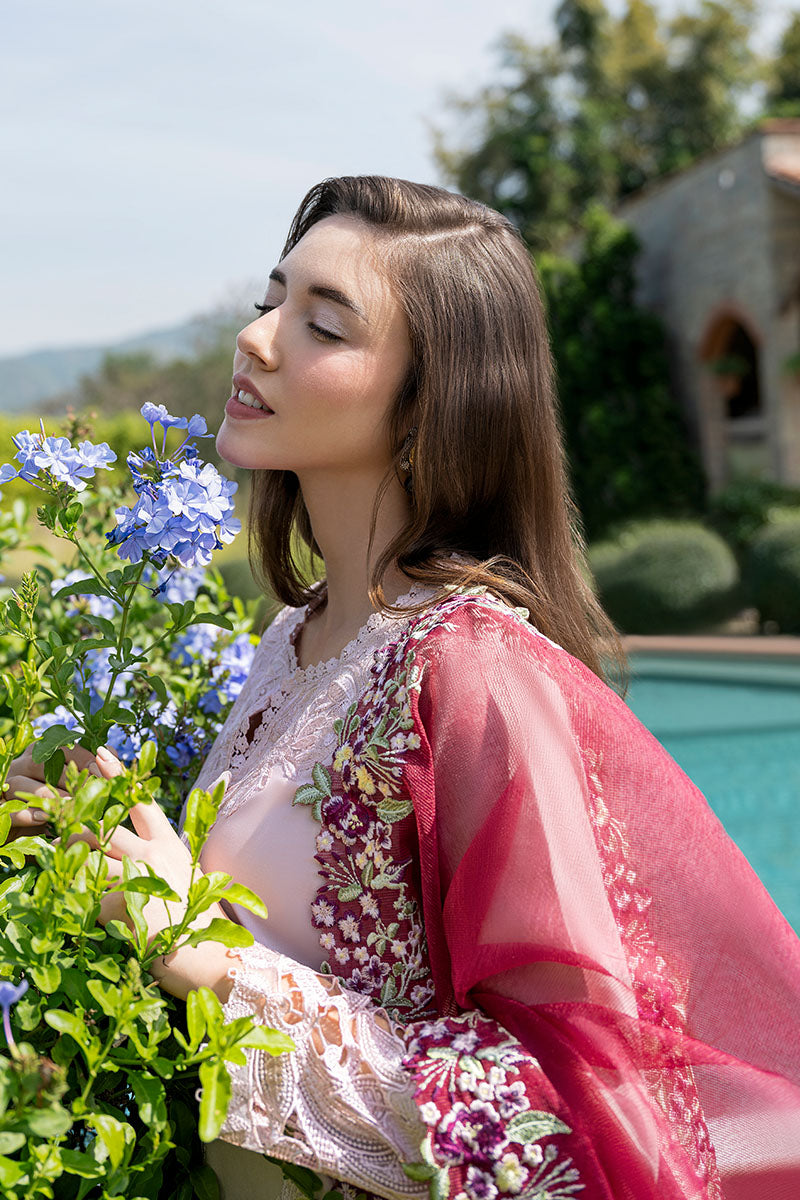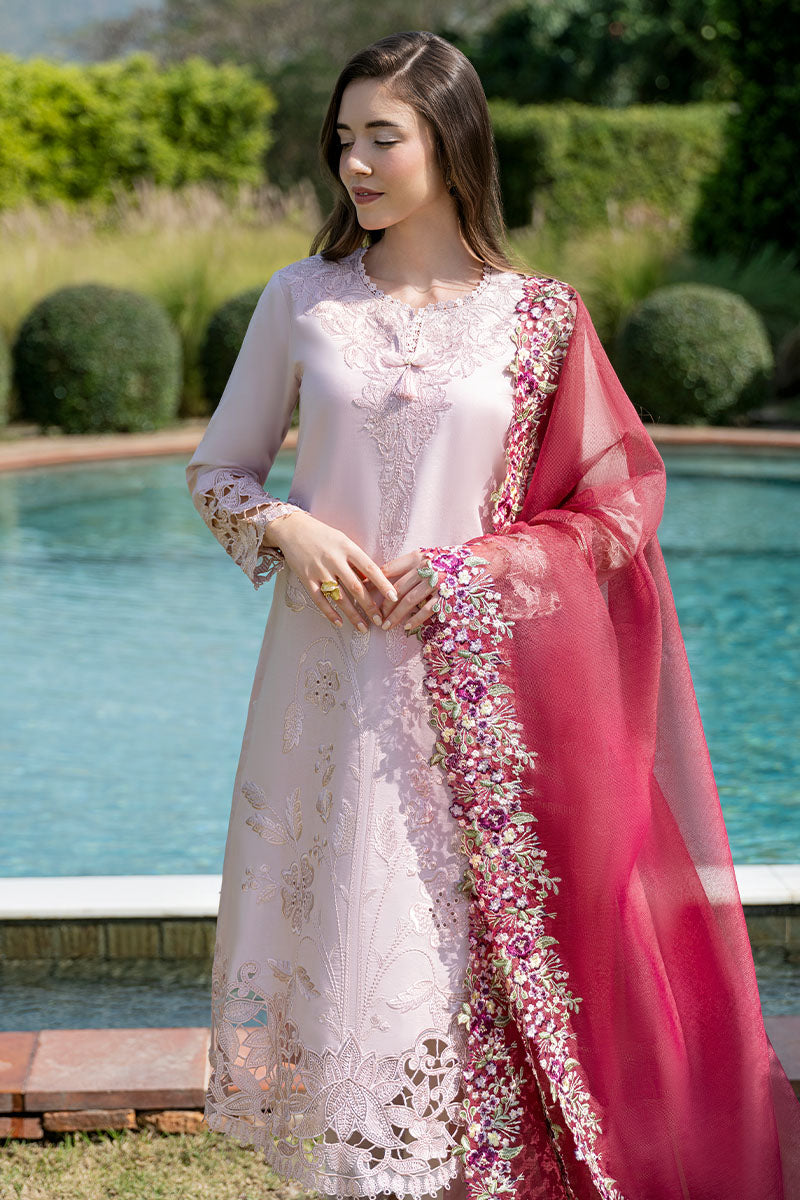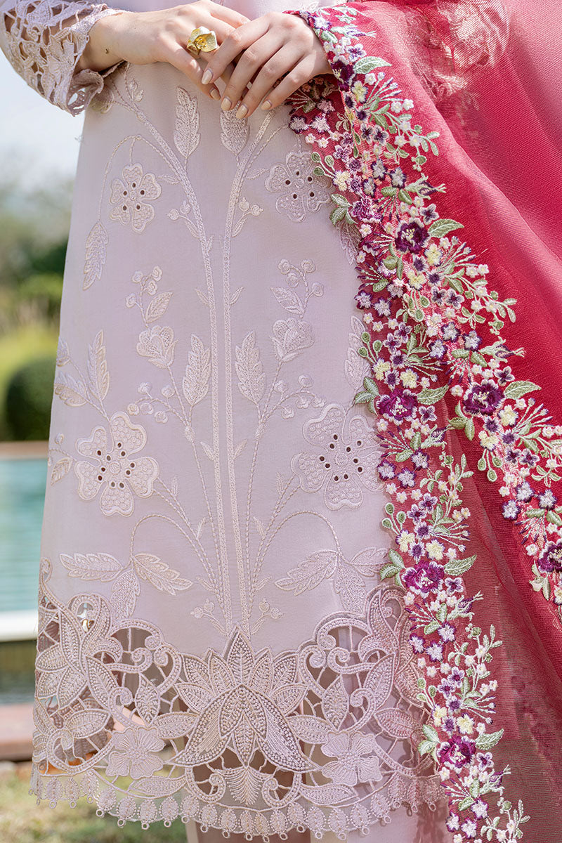 PINK NOVEAU exudes regal sophistication with a light purple cotton shirt and cotton trouser set; the neckline is perfected with a pearl tassel. The ensemble is elevated by a rich red organza net dupatta with captivating floral borders that are truly nouveau.