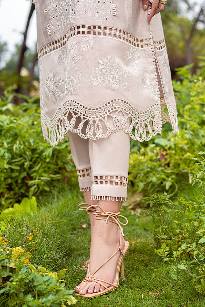 Nude cotton net canvas is embroidered with ivory silk thread to create a very soft and subtle feel. A well curated hem border adds allure to this design. It comes with an embroidered organza dupatta and pants.